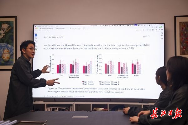刘强教授团队成员讨论不同光源颜色、纸张颜色等条件对阅读速度、阅读准确度的影响。记者 胡冬冬 摄