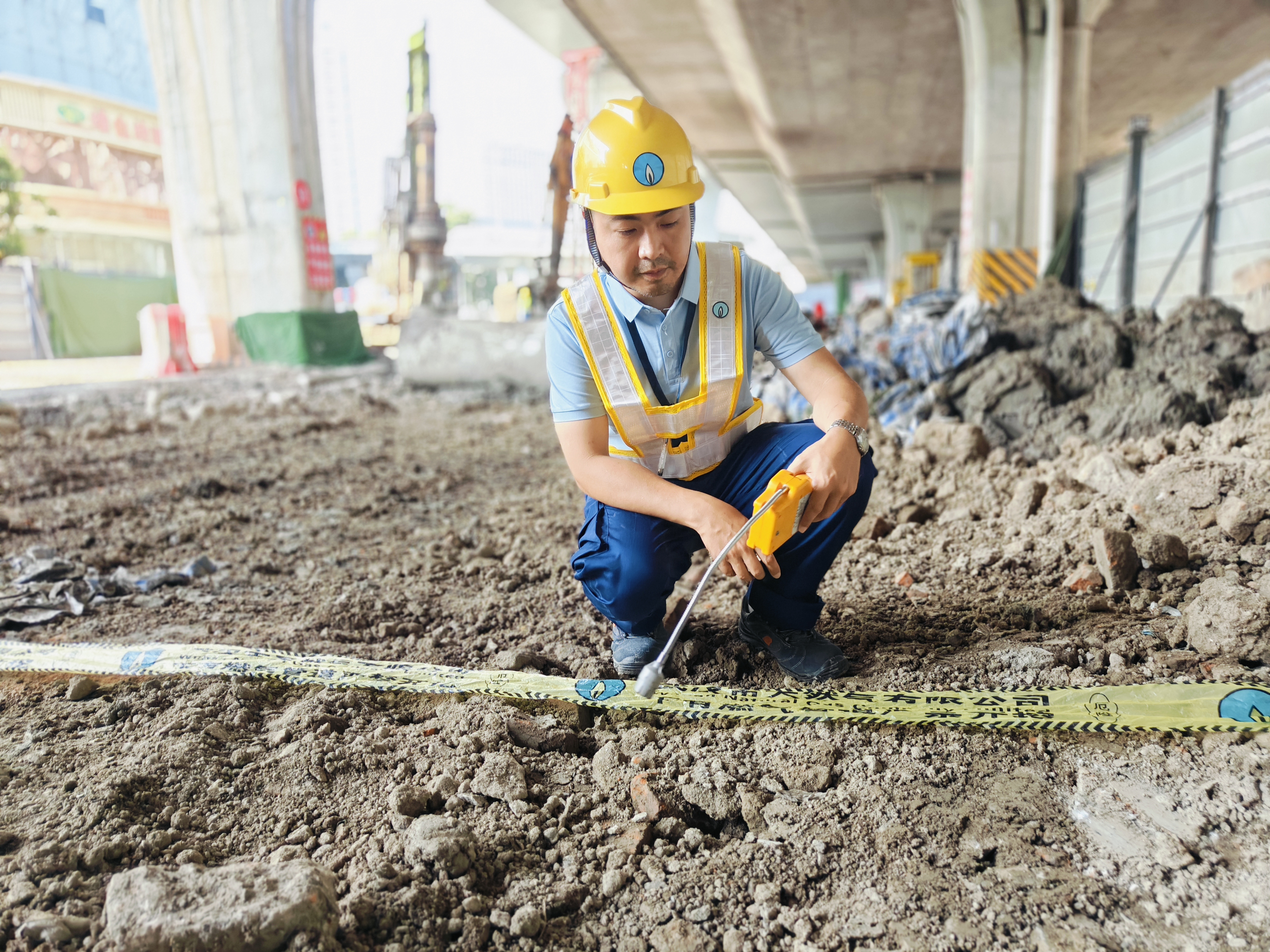 当他来到竹叶山地铁10号线施工现场时,地表温度已升至50℃。发现一处警示带破损,他及时更换后,转头对现场负责人叮嘱:“机械动土前,必须人工探明管位。”