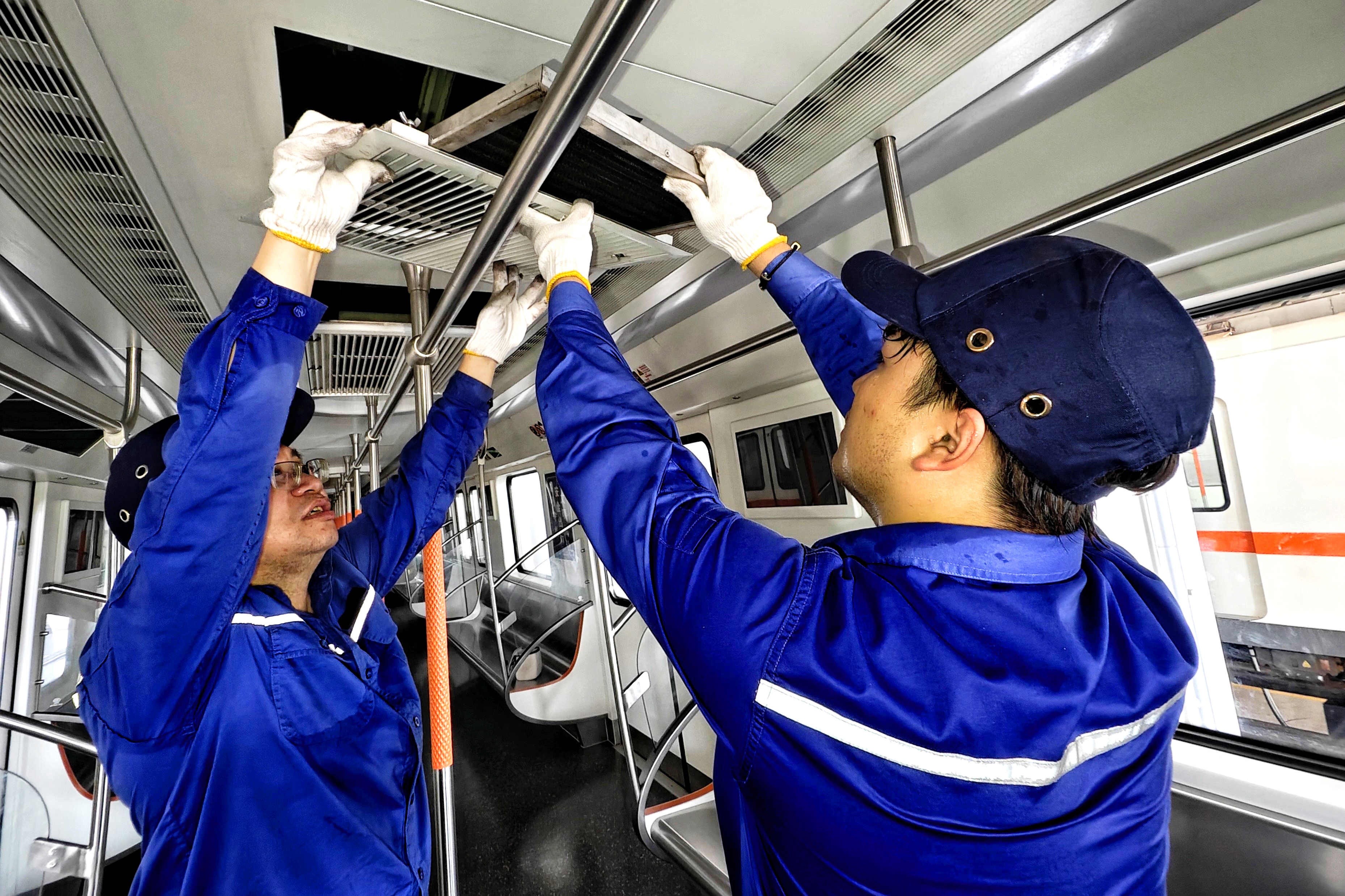地铁7号线检修人员更换列车客室空调滤网。 通讯员方正阳摄