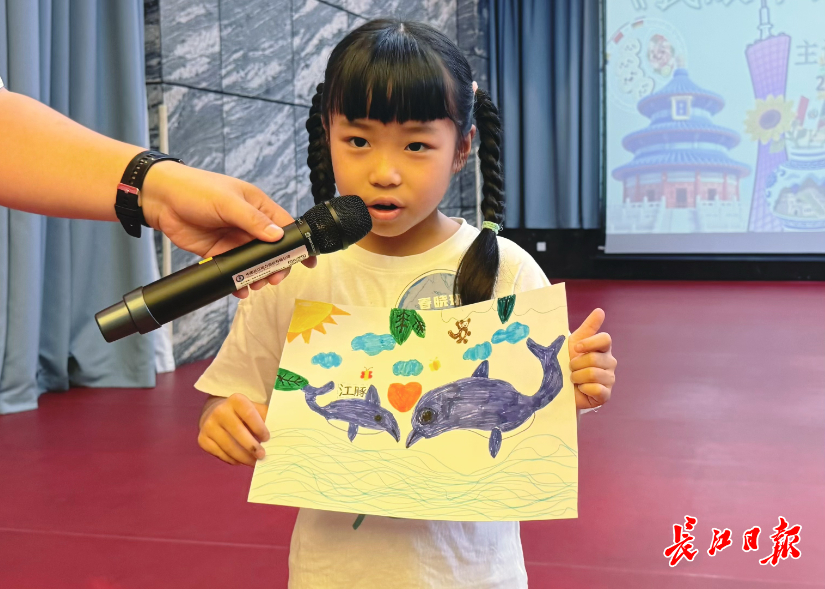 7岁的张佳宜在纸上画了两只江豚,在蔚蓝的波浪中畅游。“以前只知道大海里有海豚,后来知道,长江里有江豚,便爱上了它们。它们被称作‘微笑天使’,是武汉的城市吉祥物。”她通过翻译,向塞西莉娅介绍了自己的作品。