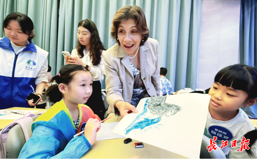 一位孩子向塞西莉娅·泰洛介绍画中的江豚。 长江日报记者何晓刚 摄