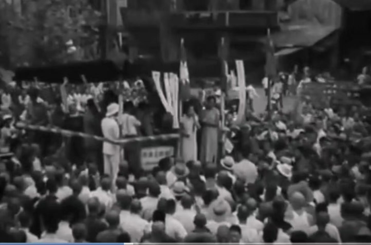 1938年7月,武汉为抗战举行捐款“献金”活动,现场市民高唱《义勇军进行曲》。 图片来自纪录片《四万万人民》截图