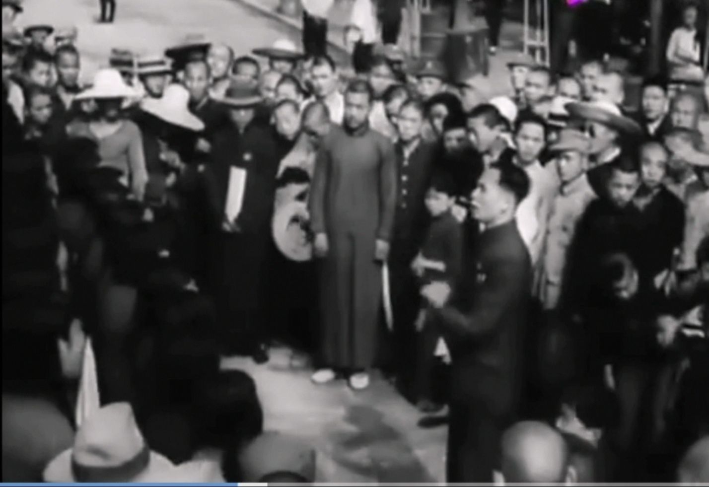1938年,武汉街头,爱国人士指挥市民唱起《义勇军进行曲》。图片来自纪录片《四万万人民》截图