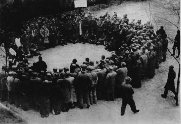 歌咏队在武汉街头唱起《义勇军进行曲》,人圈内左下黑衣者为冼星海指挥的背影。(资料照片)