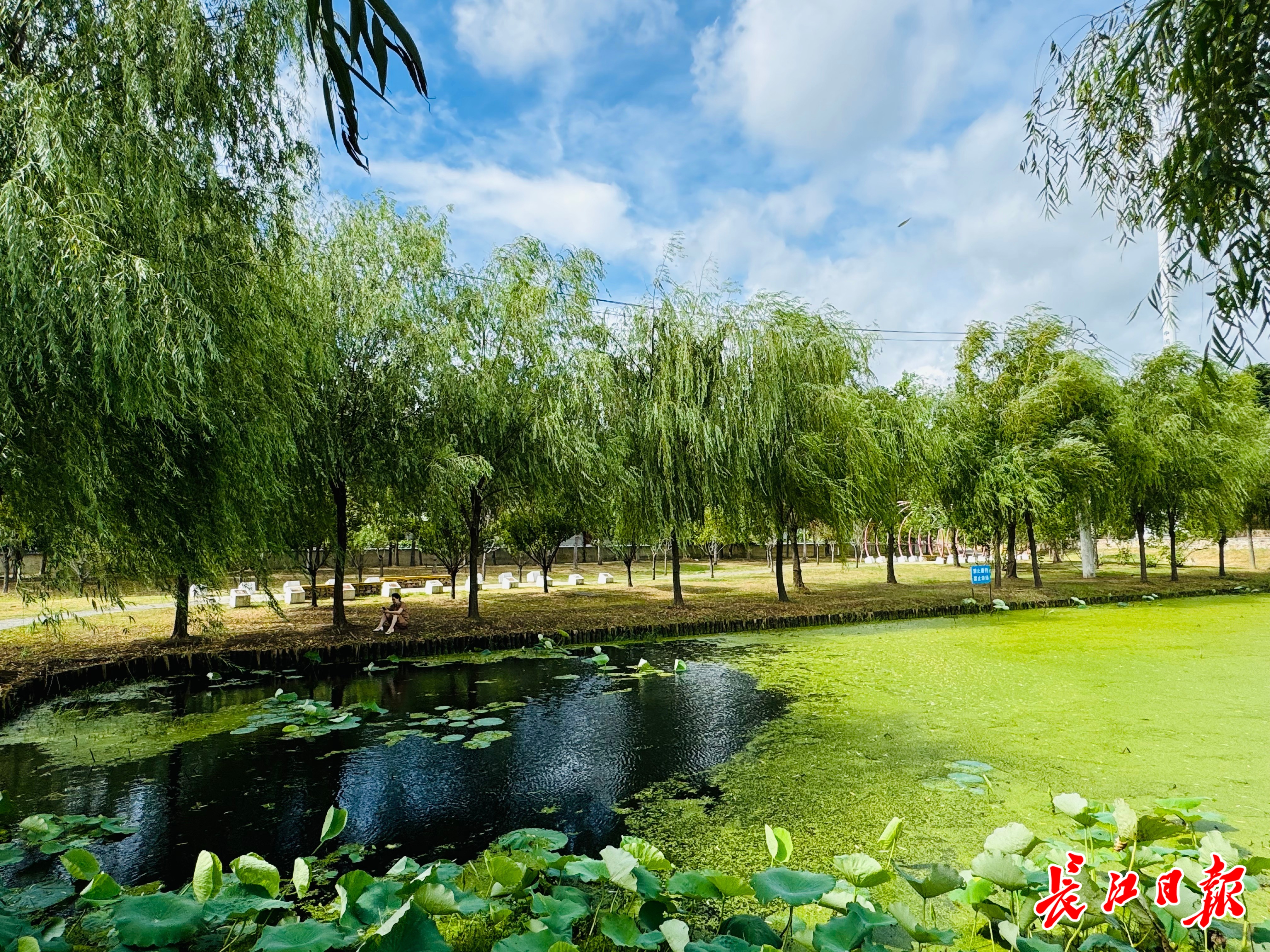 岱黄高速程家墩驿站是一座“公园式高速驿站”,有岸边垂柳、小湖荷花等风景。 长江日报记者陶常宁 摄
