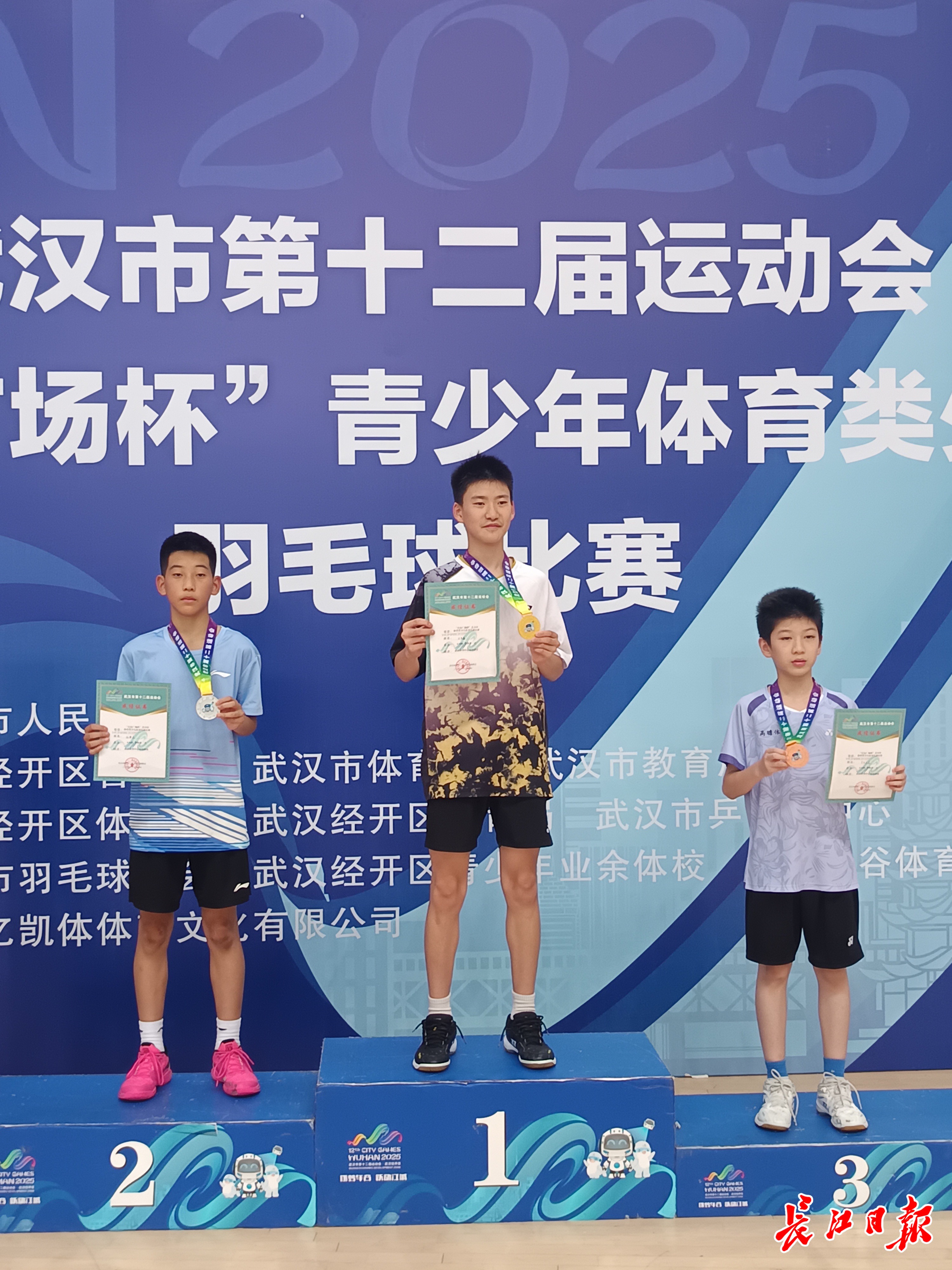 文晟羽的父母都是羽毛球专业运动员,所以他很早就接触到羽毛球。6岁左右,文晟羽在曾入选过国家羽毛球队的妈妈指导下启蒙训练,经过几年的磨炼,他的水平在本地同龄人中已成顶尖。“拿到市运会的冠军我很开心,我的下一个目标是明年继续拿U10组的冠军。”除了男单冠军外,文晟羽还随武汉经开区队拿下了男团冠军。据介绍,本次比赛东道主武汉经开区代表队共派出了11名运动员,分别参加11岁、10岁和9岁三个组别的比赛,获得3金2银和若干前八名的好成绩。武汉经开区的参赛队员目前都在武汉体育中心晟羽俱乐部常训,其中3人已经输送到武汉市羽毛球队。