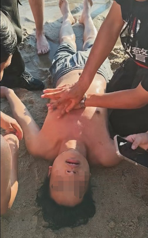 被救上岸的刘某面色青紫,嘴唇发绀,已完全没有了呼吸和意识,其生命体征也极其微弱。马寅浑身湿透地跪在沙滩上,顾不上喘息,立即对刘某实施心肺复苏术。义警队队长雷军则大声指挥队员疏散围观人群,迅速清理出一个救援空间,并快速拨打110和120电话求助。