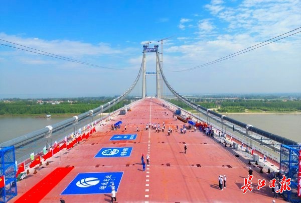 这座备受瞩目的武汉“东大门第一桥”联通了武汉市新洲区和鄂州市华容区,主跨1430米,宽50.5米,采用双向8车道设计,工程全长35.043公里,设计时速120公里,是目前长江上最宽的钢箱梁悬索桥,也是国家高速路网武汉都市圈环线的重要组成部分和湖北省“十四五”规划中的重点建设项目,将于2026年3月建成通车。