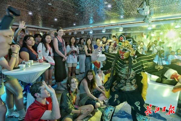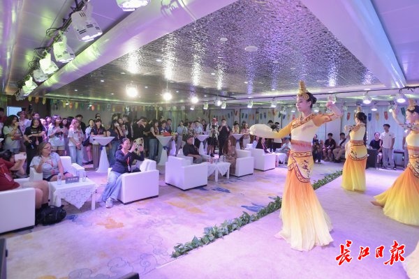 7月27日晚,“美国飞虎队代表团”登上“长江荣耀号”游船,感受武汉壮阔夜景。随着主持人热情洋溢的开场,“知音湖北·长江之夜”中美青少年文艺汇演拉开帷幕。率先登场的是一曲舞蹈《黄鹤楼》,舞者头顶黄鹤楼的精巧造型,翩翩起舞间,仿佛将观众带入了千年前的诗画之中,让美国青少年真切地领略到楚文化的浪漫与底蕴。