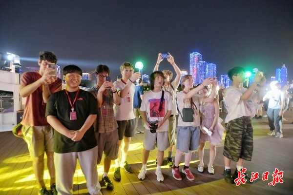当大家走上游船甲板,凉爽的江风扑面而来,宽阔的江面豁然开朗,长江两岸的楼宇灯火辉煌,一幅气势恢宏的巨幅画卷在眼前徐徐展开。远处的黄鹤楼在灯光的映照下熠熠生辉。来自美国的大二女生安吉拉·林惊喜地说:“原来刚才舞者头顶的造型就是这座楼。它比我在照片上看到的更加壮观,充满了历史韵味。”