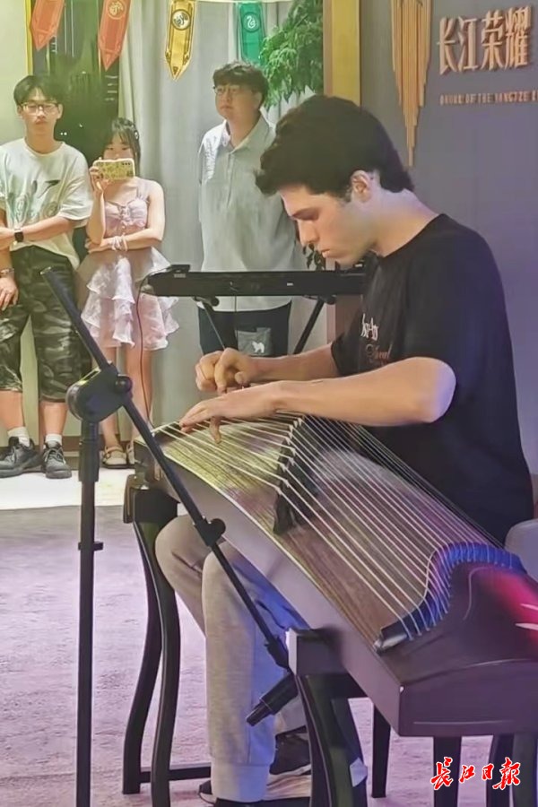 7月27日晚,在“长江荣耀”号上,“知音湖北·长江之夜”中美青少年文艺汇演活动开启。来自江汉大学的大学生石刘昕带来一曲古筝《盛世国乐》,引来美国青少年的热烈掌声。在交流环节,美国青年瑞·马可主动走上舞台,告诉主持人自己想当众演奏一曲古筝。他向石刘昕借了弹奏古筝的甲片,两人一起调试乐器。随后,瑞·马可在舞台上演奏一曲《蒙古利亚歌》。石刘昕在舞台侧面听着琴声,忍不住鼓起掌,“他只学过一年多,就能弹奏得这么流畅,非常厉害!”