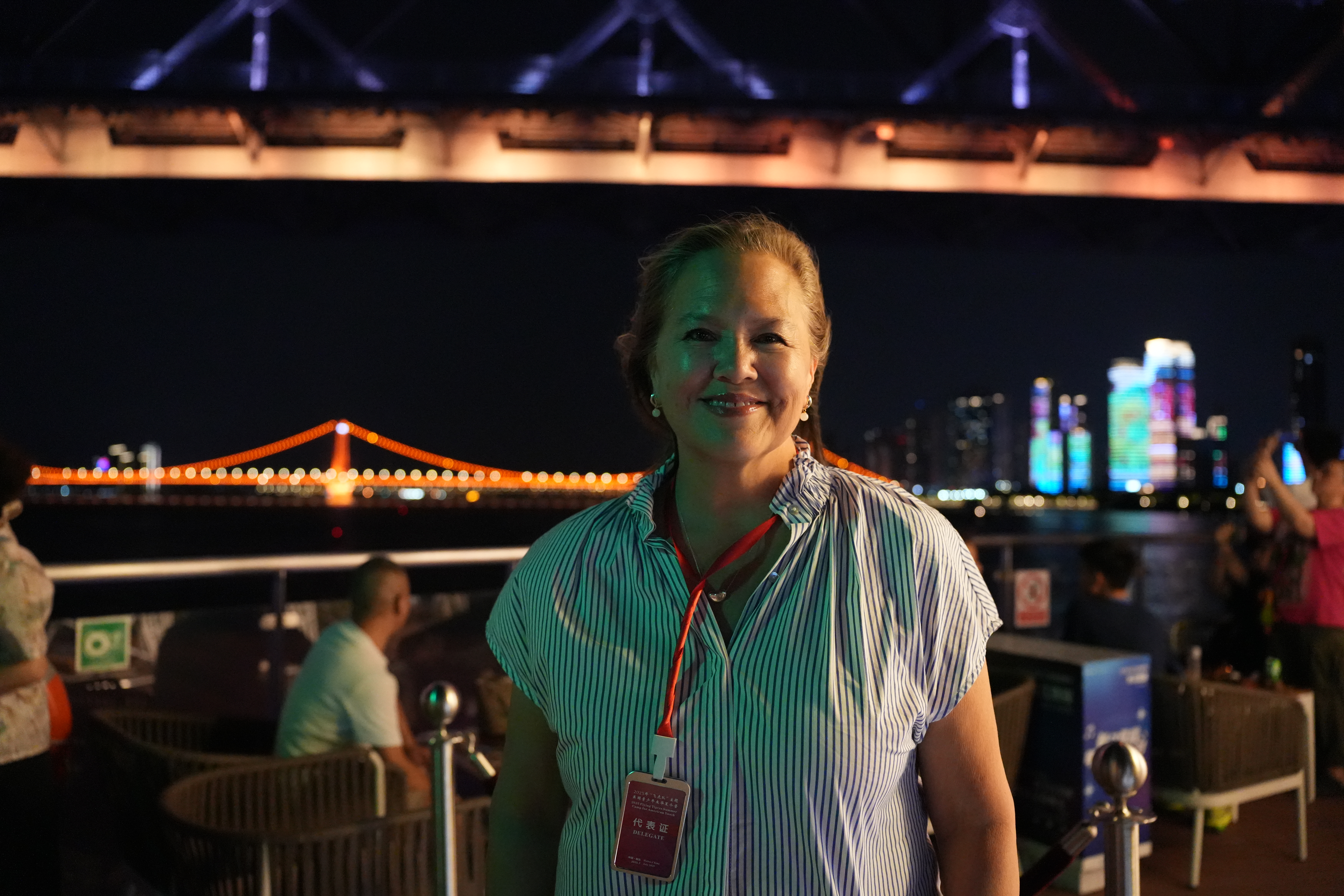 晚上9时,轮船从鹦鹉洲长江大桥下穿过,江风带着湿润的气息扑面而来。“这里的天气非常温暖,比我住的费城要温暖、湿润一些,我很喜欢。”来自美国费城的高中生娜迪娅·萨拉蒙望着轮船窗外的大桥说,“这桥真壮观,造型很特别,刚看到时就觉得很惊艳。”她接着说,“我听说过飞虎队的历史,特别敬佩他们以及在那段历史里互助的两国人民。”