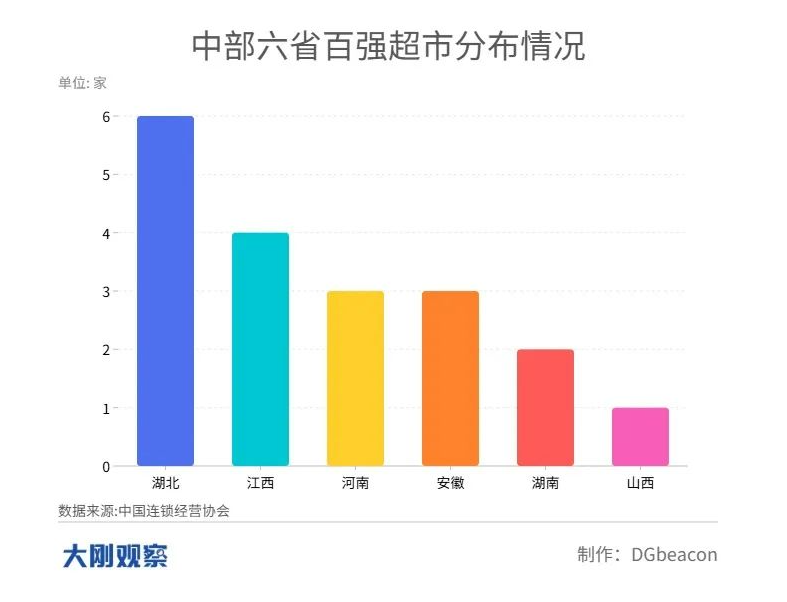 湖北以6家百强超市登顶中部超市第一省,占中部近1/3。