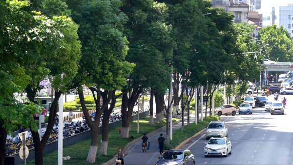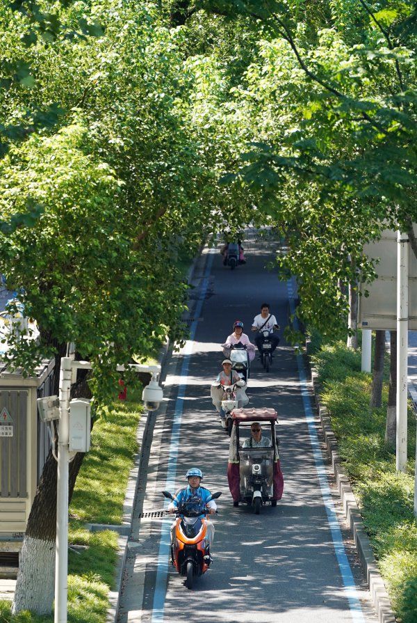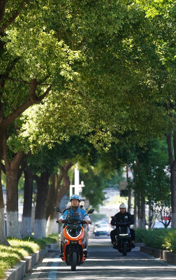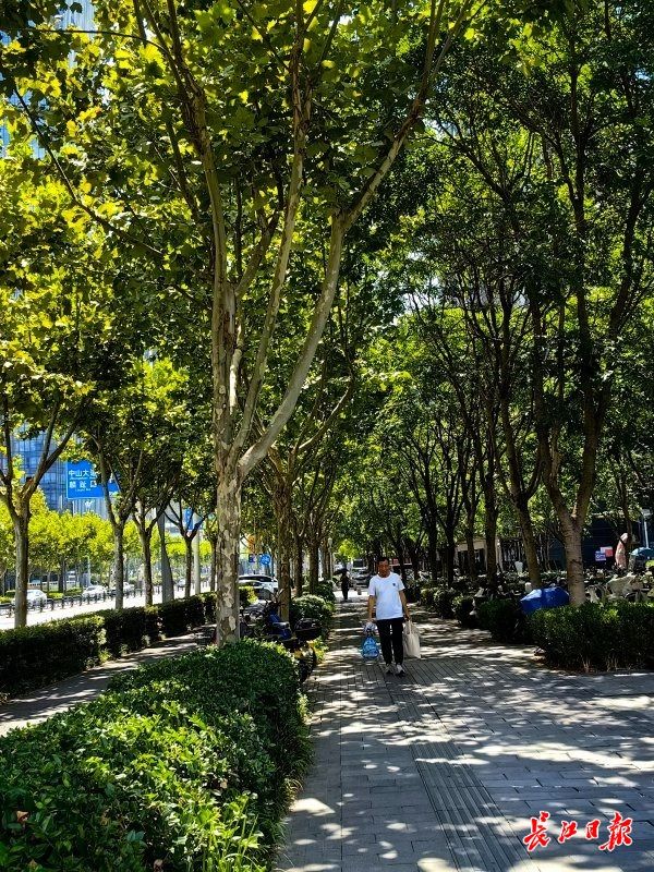 长江日报大武汉客户端7月29日讯 7月28日上午10时许,“饿了么”外卖骑手陈建刚骑着电动车,从汉口解放大道拐进新华路,一路行至取水楼,沿路林荫夹道。他说:“夏天骑行在这条林荫路上,很凉爽、很舒服。”