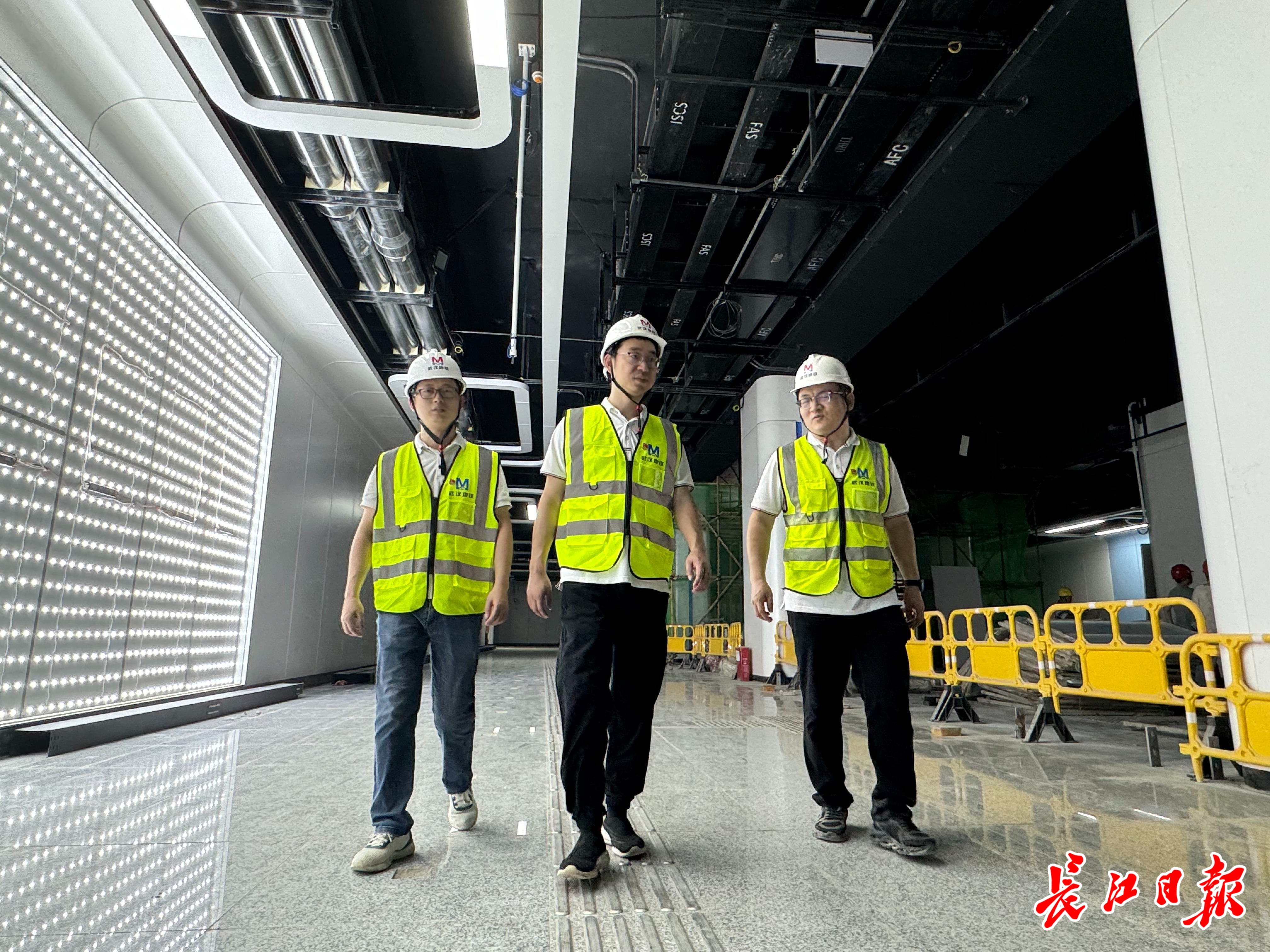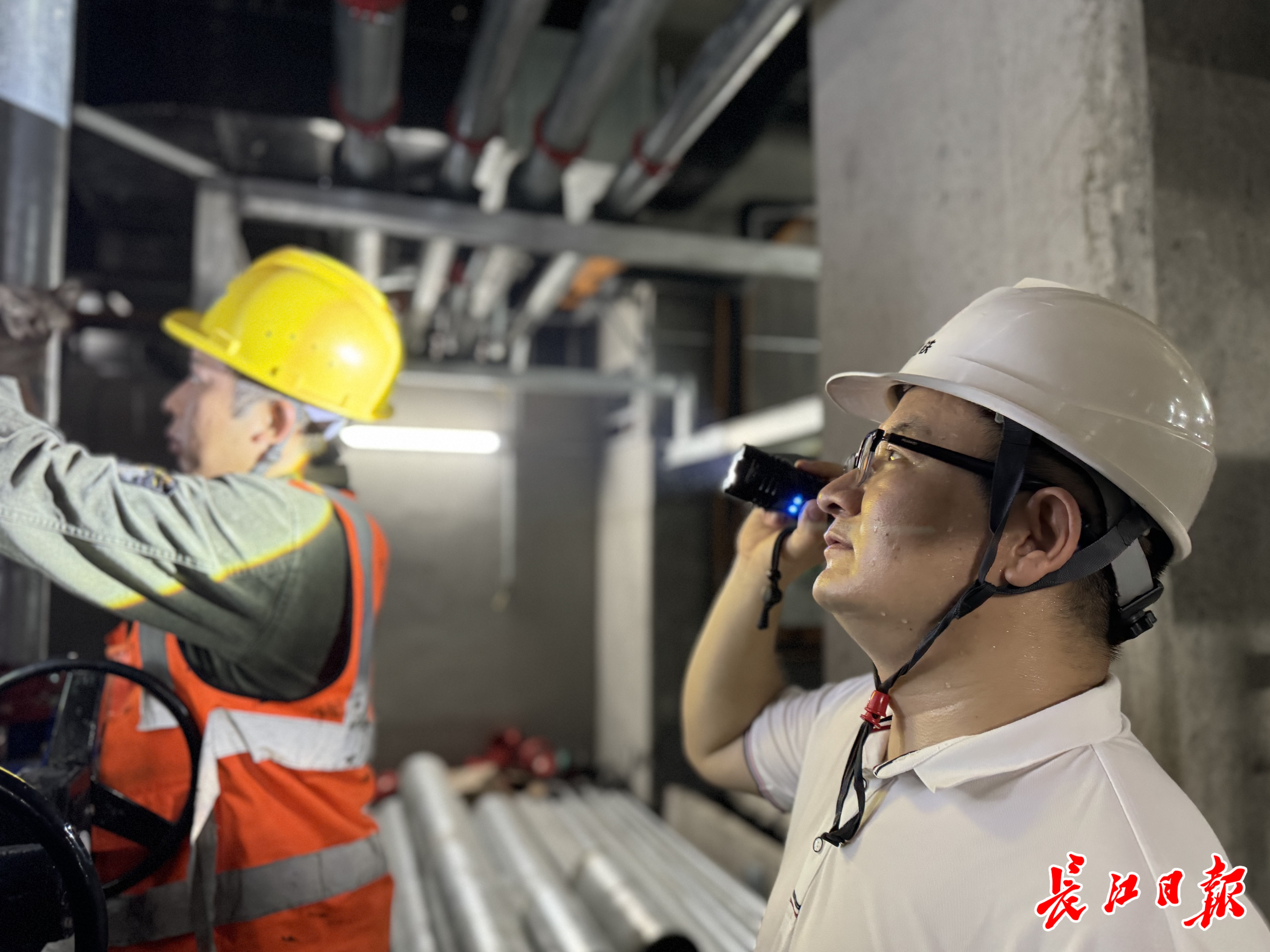 在园林路站,党支部委员、武汉地铁二级项目经理朱晓振正在检查消防系统安装。他说:“在地铁建设过程中,风水电系统‘承上启下’。当车站建好,需要进行设备区装修,安装通风、空调、防排烟、给排水、水消防和低压配电等系统,材料多、工序多,可以说是最烦琐的一环。”