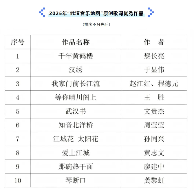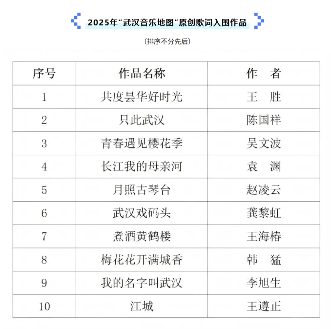 2025年“武汉音乐地图”原创歌词征集评选活动改为针对歌词作品展开,不仅再次引发武汉音乐人的创作热情,更收到了全国各地创作者的参评作品。活动共收到歌词291首,经专家评审团评审、网络公示,最终评选出原创歌词优秀作品10首,包括《千年黄鹤楼》《汉绣》《我家门前长江流》《等你晴川阁上》《武汉书》《知音北洋桥》《江城花 太阳花》《爱上江城》《那碗热干面》《琴断口》等,同时评选出原创歌词入围作品10首。