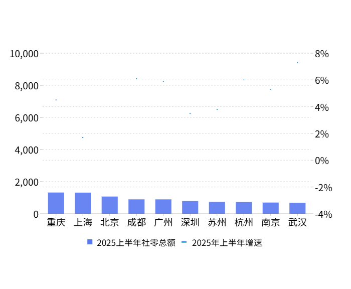 2025年上半年,杭州社零增速为6%,居十强城市第三位。