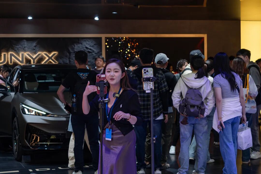 ▼4月26日,2025上海汽车展会现场,部分车企开启直播卖车模式。图/视觉中国