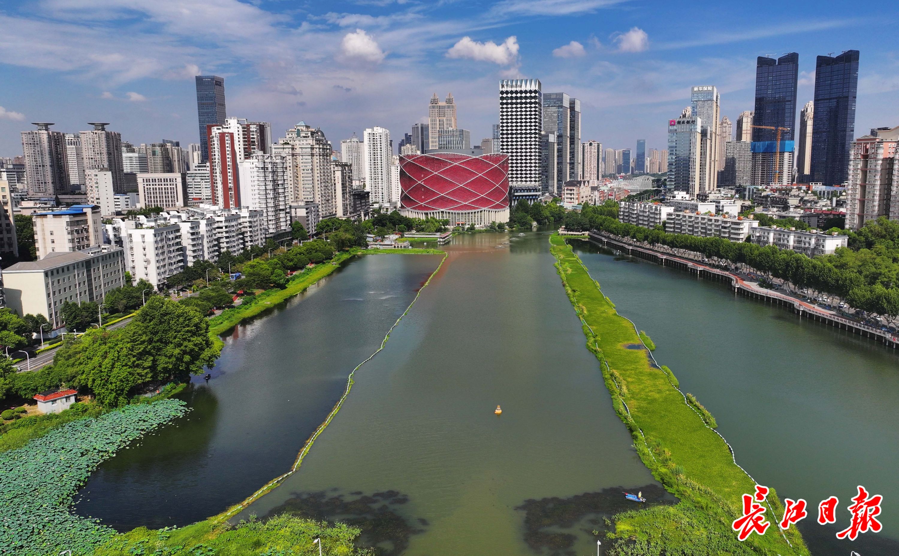 7月31日,长江日报记者在水果湖畔看到,水面清波荡漾,水中水草茂密,大片水生植物绵延湖边,如同一条翠绿的“裙边”,让这座城中湖更显精致秀美。