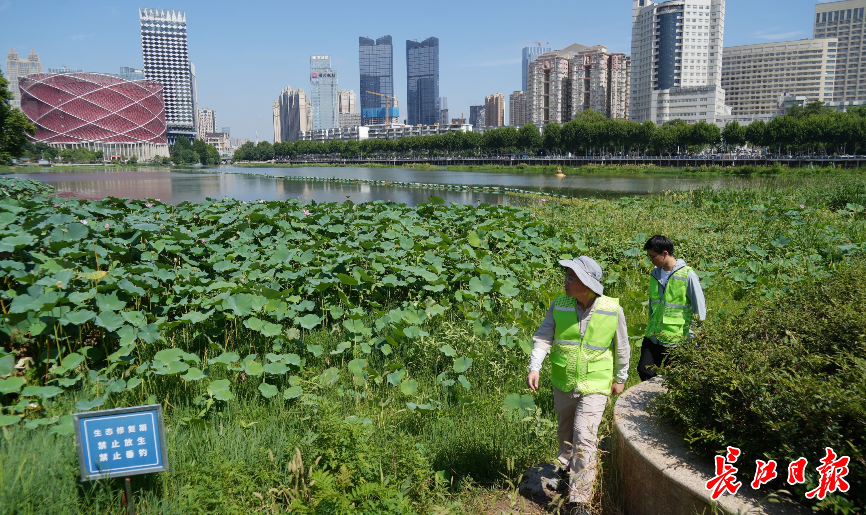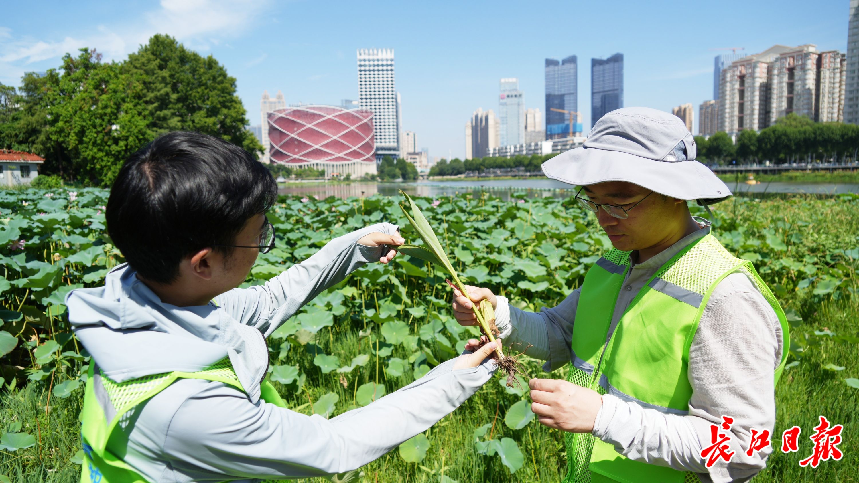 武昌区湖泊维护站站长王聪(右)和同事观察水生植物生长状况。长江日报记者何晓刚摄