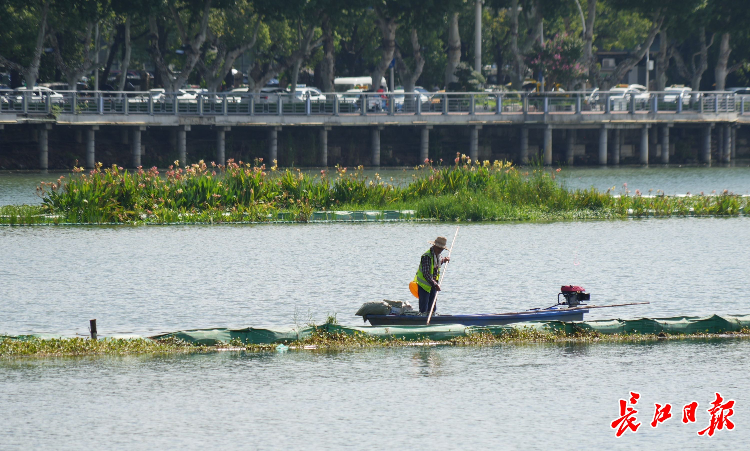湖泊养护人员每日巡查水果湖岸线,维护水生植物生长。长江日报记者宋磊摄