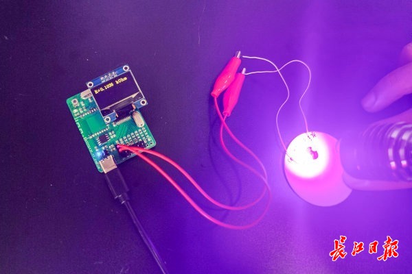 有紫外线灯照射电子试纸,剂量计数据实时变化。记者 胡冬冬 摄