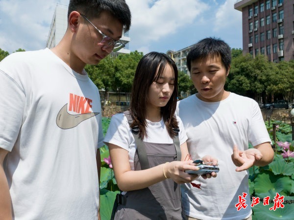 易颖(右一)教授团队在室外阳光下测试紫外线剂量计。记者 胡冬冬 摄