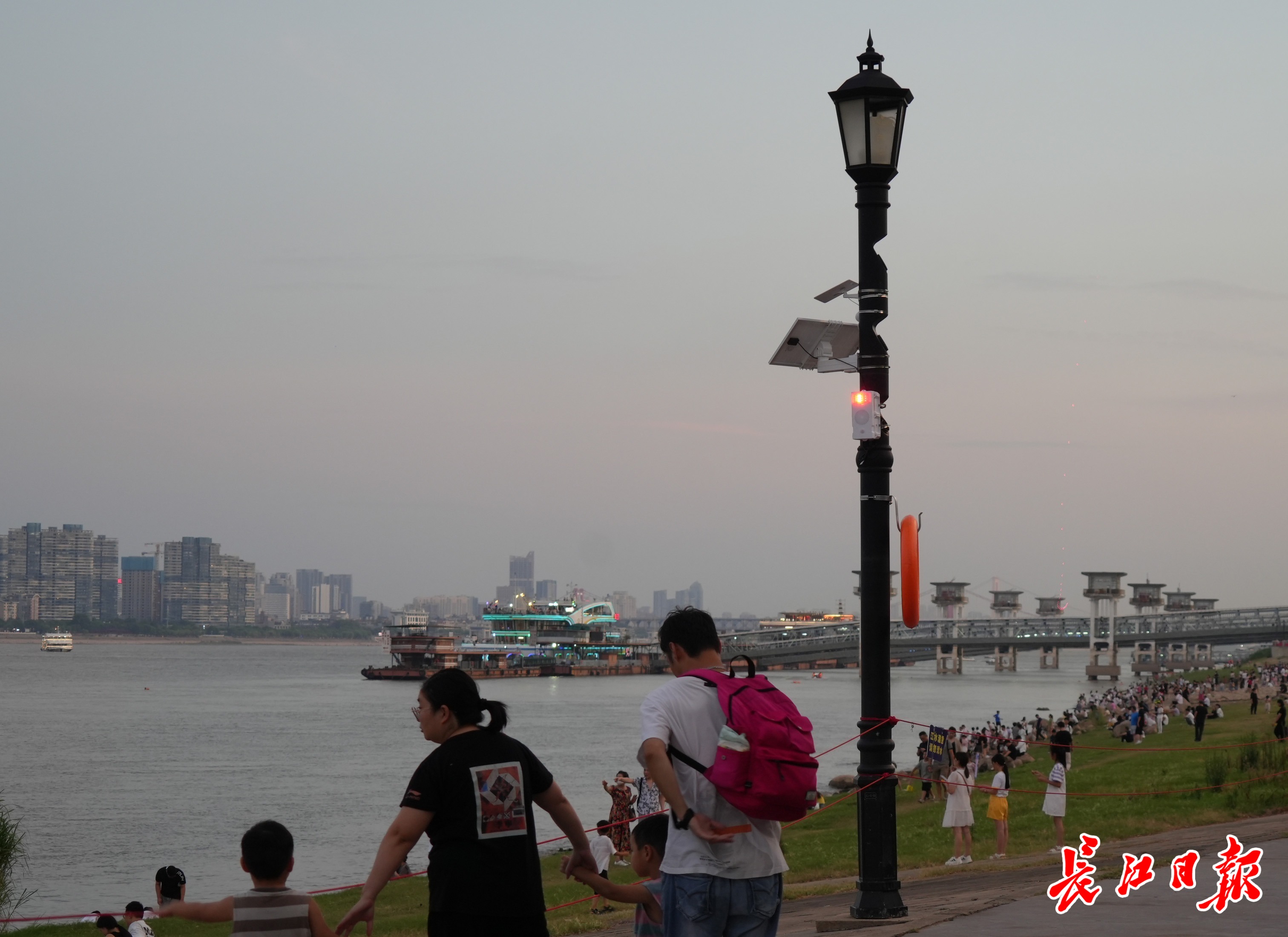 2日晚,记者在江滩大舞台附近亲水区看到,几支路灯杆上安装了光伏板和白色盒型设备。周晓煜说,这也是武汉江滩今年的“科技上新”——太阳能红外线感应报警器,已在市管江滩安装了17套。“它运用太阳能充电,以红外线探测,一旦有人靠近江边,便会发出语音提示,劝导大家注意亲水安全。”