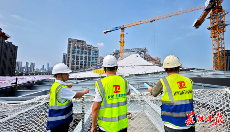 “屋面施工容不得半点马虎,从金属檩条、底网到保温层、防水层、太阳能板,每道工序都要层层衔接。现在底网铺设完成了80%,即将开始铺设防火保温岩棉。”武汉城建集团建设管理公司项目经理夏露边走边介绍,话音未落,他和武汉建工集团项目经理武建辉再次蹲下,仔细检查屋面施工质量细节。