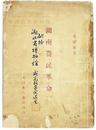 微黄书页,微损边角,悠长岁月溢出屏幕。封面上,三行印刷体字样:“毛泽东著”“湖南农民革命(一)”“汉口长江书店印行”,还有两行手书毛笔字:“献给湖北省博物馆”,落款“咸高教员余遂生”。