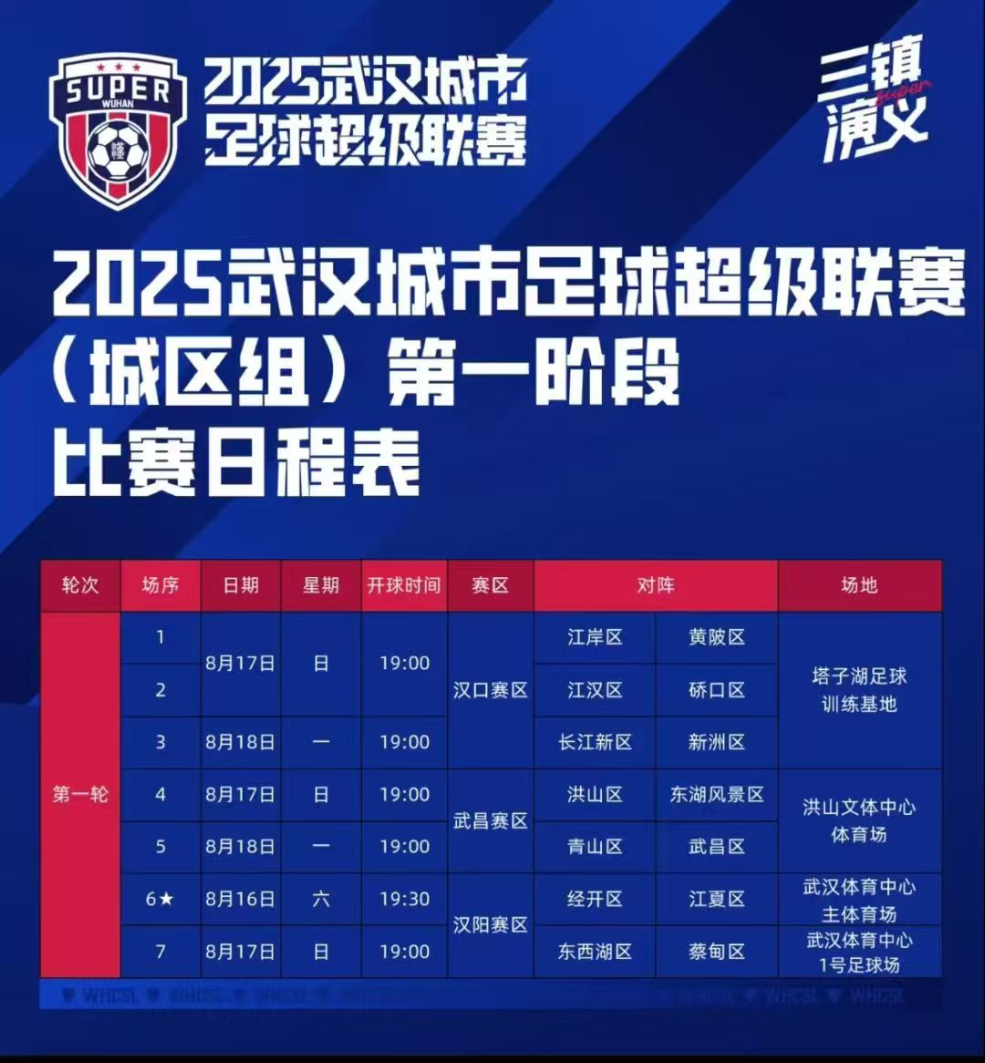 长江日报大武汉客户端8月12日讯(记者马万勇)2025武汉城市足球超级联赛(简称“汉超”)将于本周六拉开战幕,根据组委会最新出炉的对阵表,揭幕战将于8月16日19:30打响,由武汉经开区足球队迎战江夏区足球队。