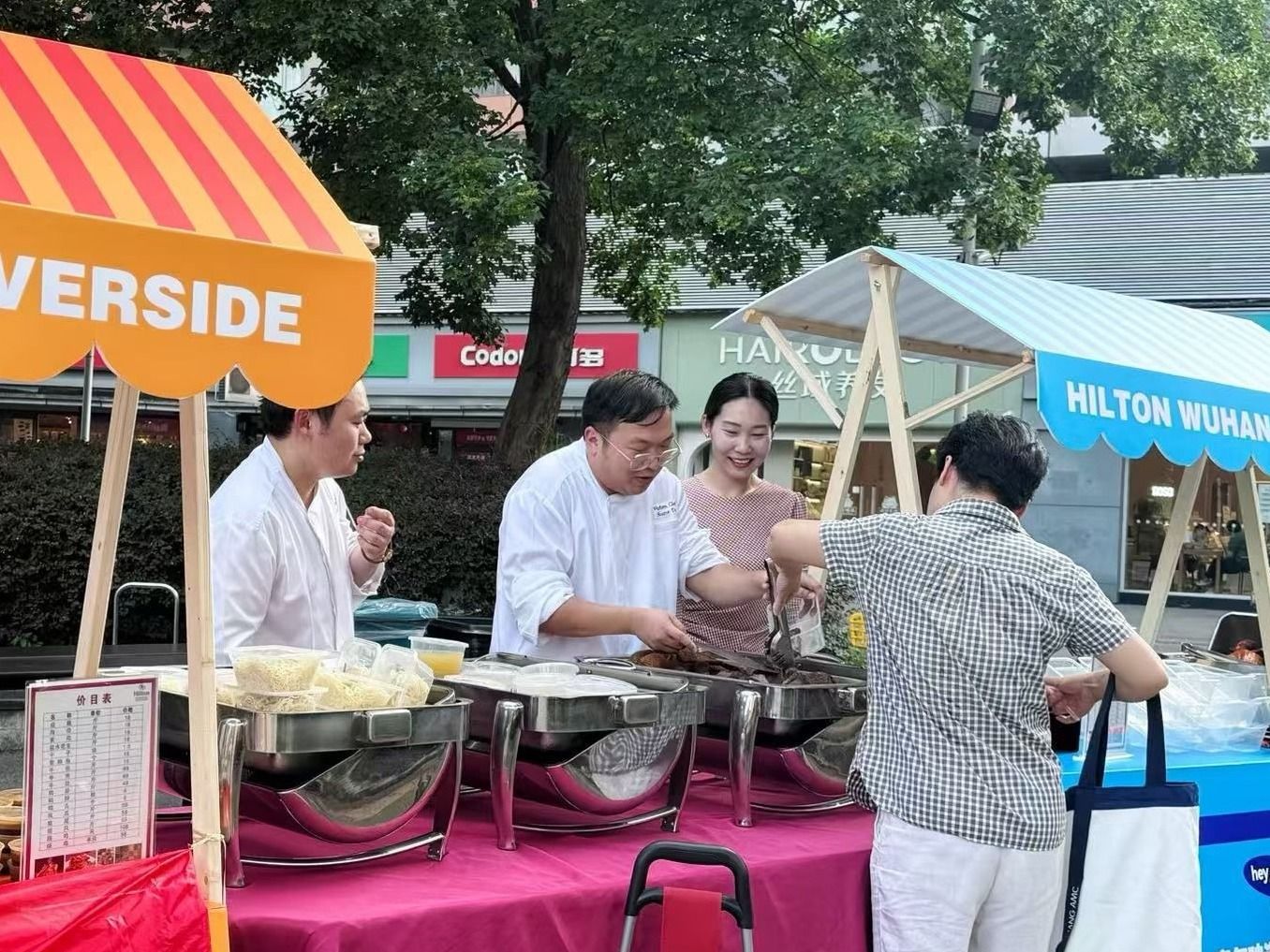 世茂希尔顿酒店门口摆起美食摊位,老村长餐饮推出汉味小吃移动餐车,丹枫白露酒店用外摆区域提供堂食加外卖服务……多元消费场景让市民在夏夜流连忘返。