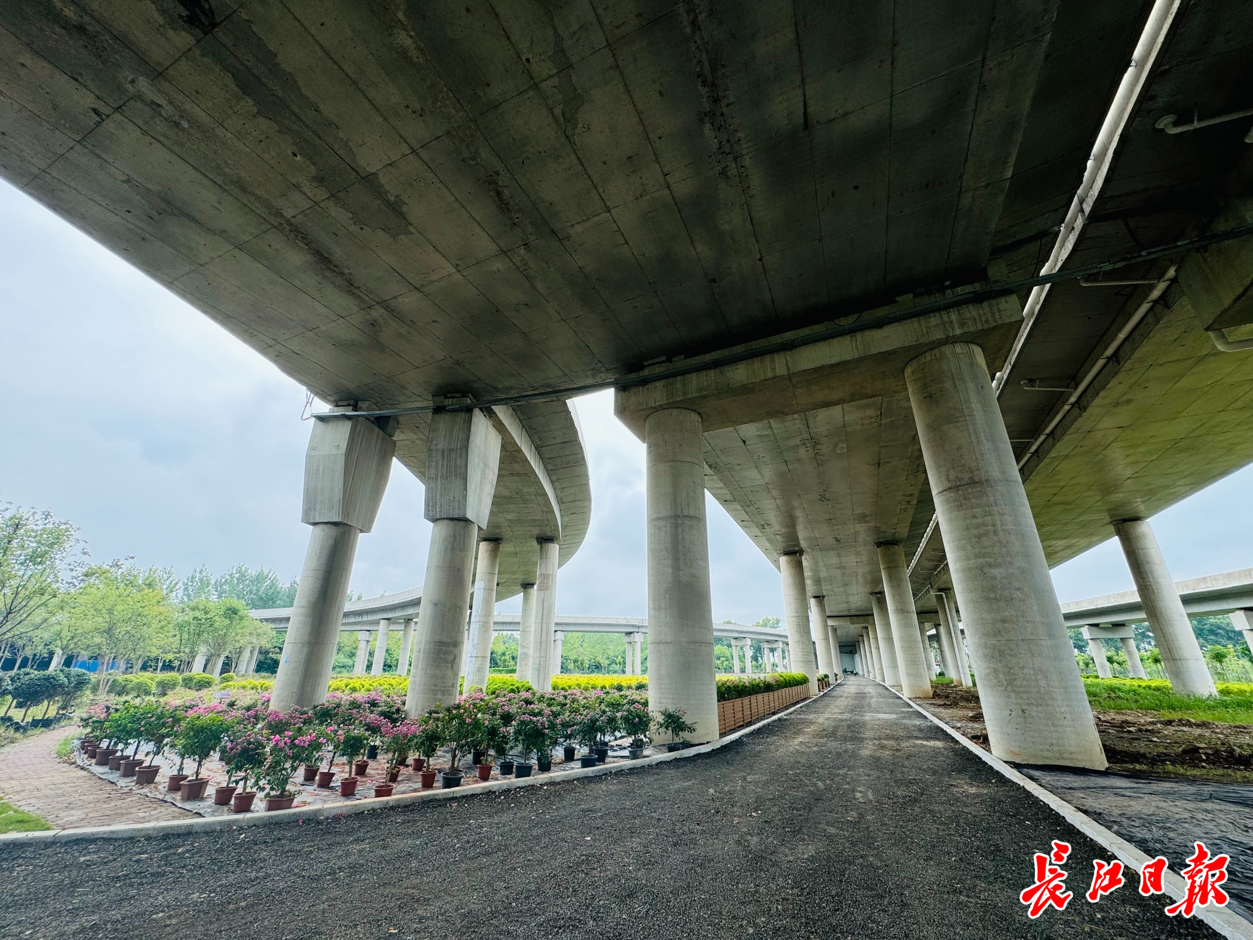 8月13日,长江日报记者驱车经过东西湖区硚孝高速东山互通立交,只见曾经闲置的88亩桥下空间,如今已变成集生态、经济、科技于一体的“绿色宝库”。亮晶女贞、三角梅、月季、马尼拉草等绿植生机勃勃,从高处俯瞰,仿佛大自然在此打翻了调色盘。