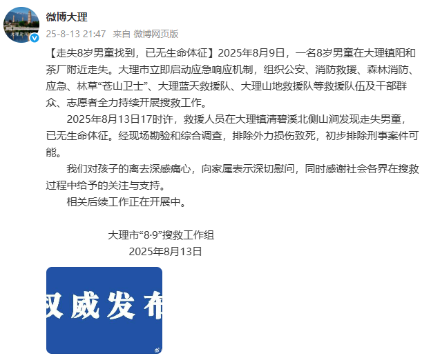 2025年8月13日17时许,救援人员在大理镇清碧溪北侧山涧发现走失男童,已无生命体征。经现场勘验和综合调查,排除外力损伤致死,初步排除刑事案件可能。