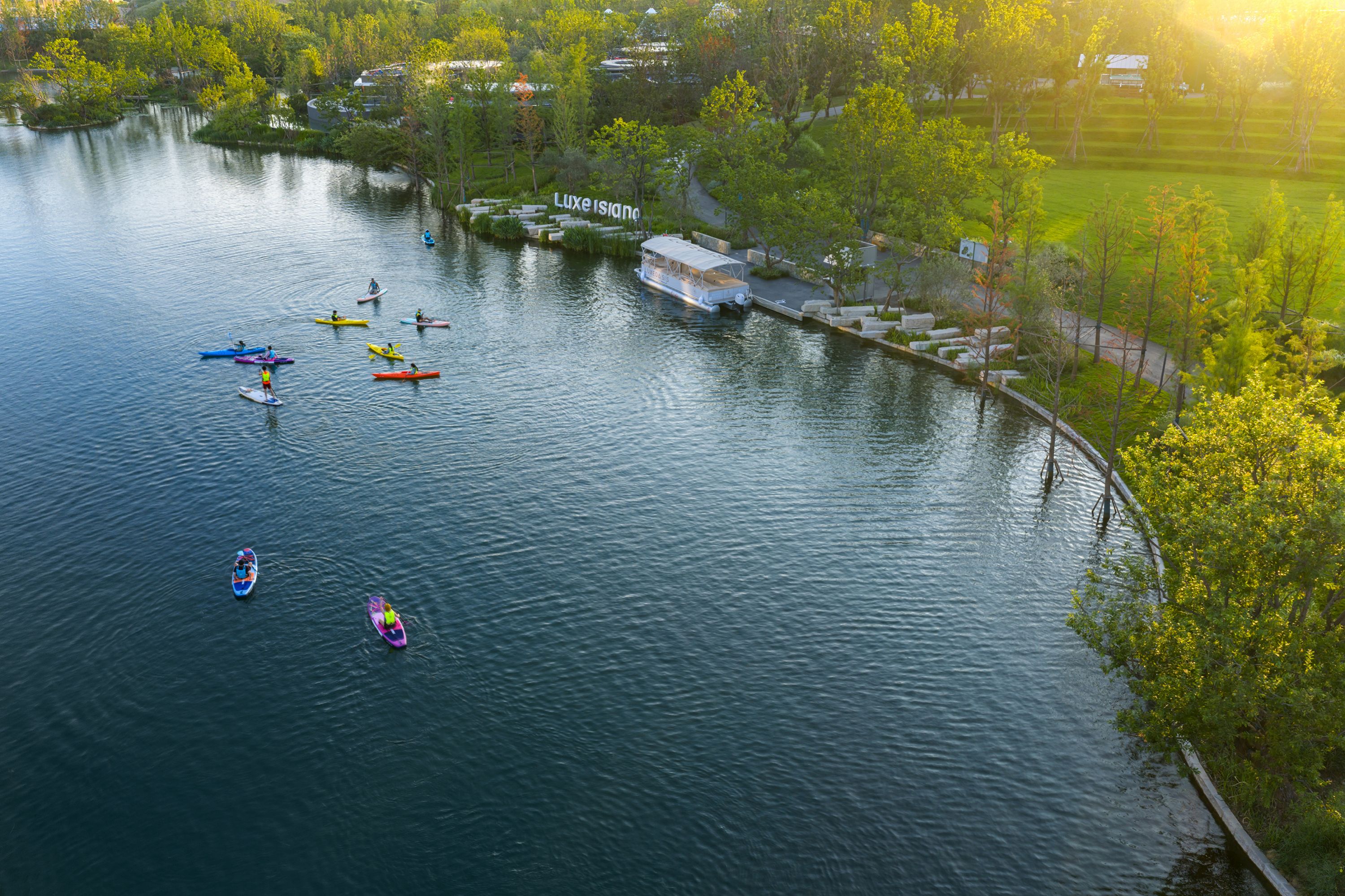 依托丰富的水域资源,麓客岛打造了多层次亲水体验:“玩水营地”提供皮划艇、桨板、背包船等专业水上运动装备租赁与教学;“水线公园”融合互动科技玩水装置,让孩子们在嬉戏中学习水文知识。即将开放的“慢船中心”“岛风礼堂”及“沙滩俱乐部”,将以独特建筑美学进一步深化人与水、人与城的连接。
