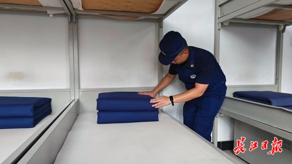 邓勇生前工作的武汉市硚口区常码头专职小型消防站里,同事正在整理邓勇的床铺。 记者詹松 摄