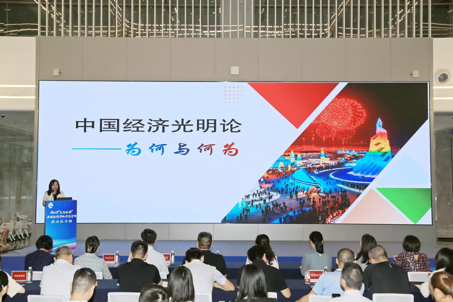 当天,洪山区经科局高新技术科负责人朱玉晓与洪山科投集团董事长喻峰则立足“洪山环大学创新发展带”建设,分别解读了“山水星光”计划带来的政策机遇以及“五位一体”全要素科创供应链体系建设情况;情景剧《筑梦·与大学之城迭代共生》与歌曲《领航》生动展现了洪山“英雄基因”与“创新密码”的实践。湖北工业大学马克思主义学院副院长华倩从理论高度宣讲了《中国经济光明论——为何与何为》。她说,武汉具备规模优势、市场优势、人才优势,最终汇集成创新优势,都印证了高质量发展信心不是“无源之水”。正视困难、坚定信心,从扩大内需、科技创新、改革开放、兜牢底线等方面奋发有为,各方面积极因素都将转化为发展实绩。