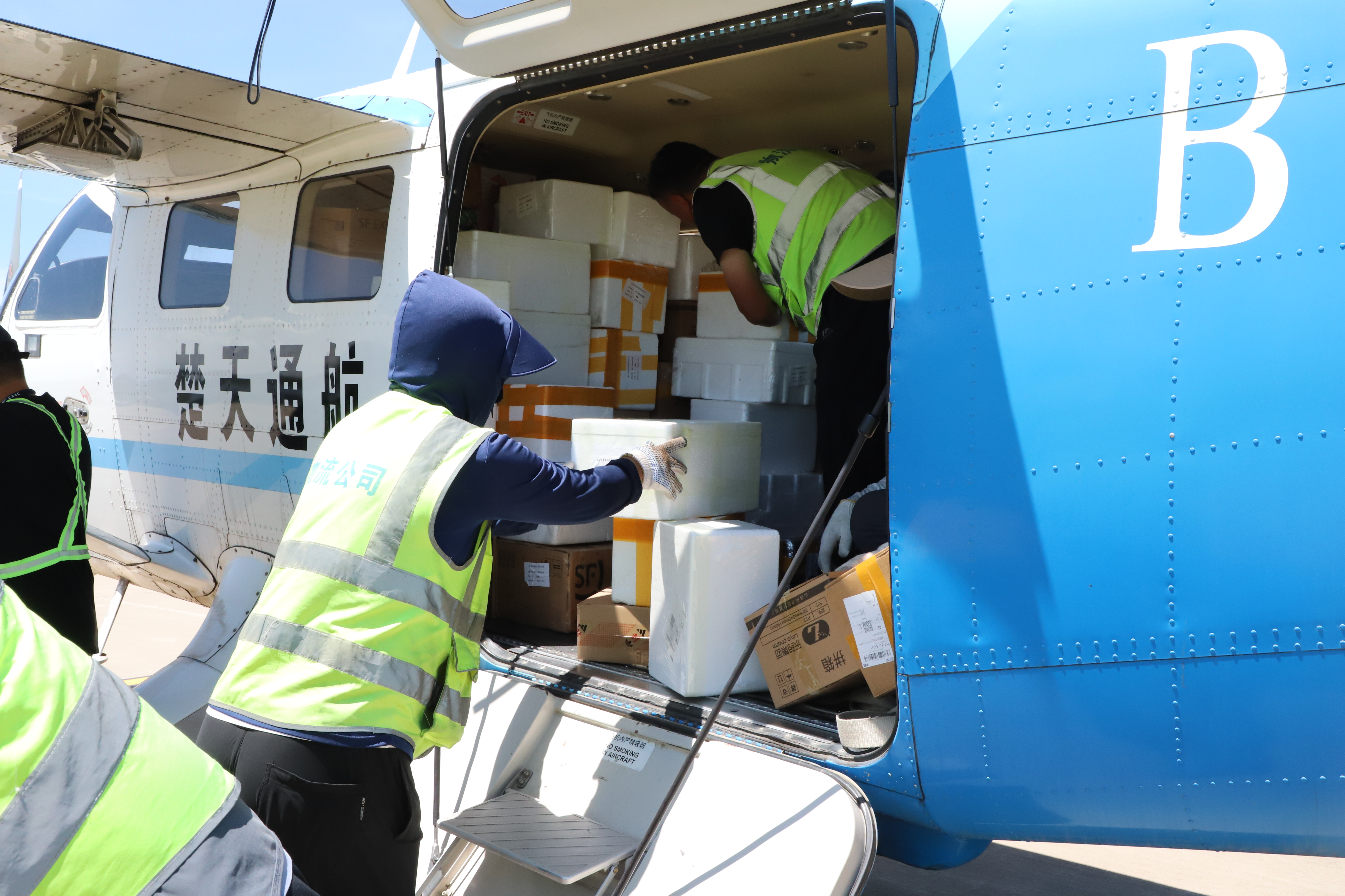 长江日报大武汉客户端8月15日讯 8月15日14时03分,一架装载517公斤印度加尔各答运来的青蟹和顺丰快件等货物的“大棕熊”100型通用飞机,从花湖机场起飞。30分钟后,“大棕熊”在天河机场降落,“武汉⇌鄂州”通用航空短途货运往返航线成功首航。随后,这批货物将通过天河机场多架客机的腹舱,送到各地不同地方客户的手中。