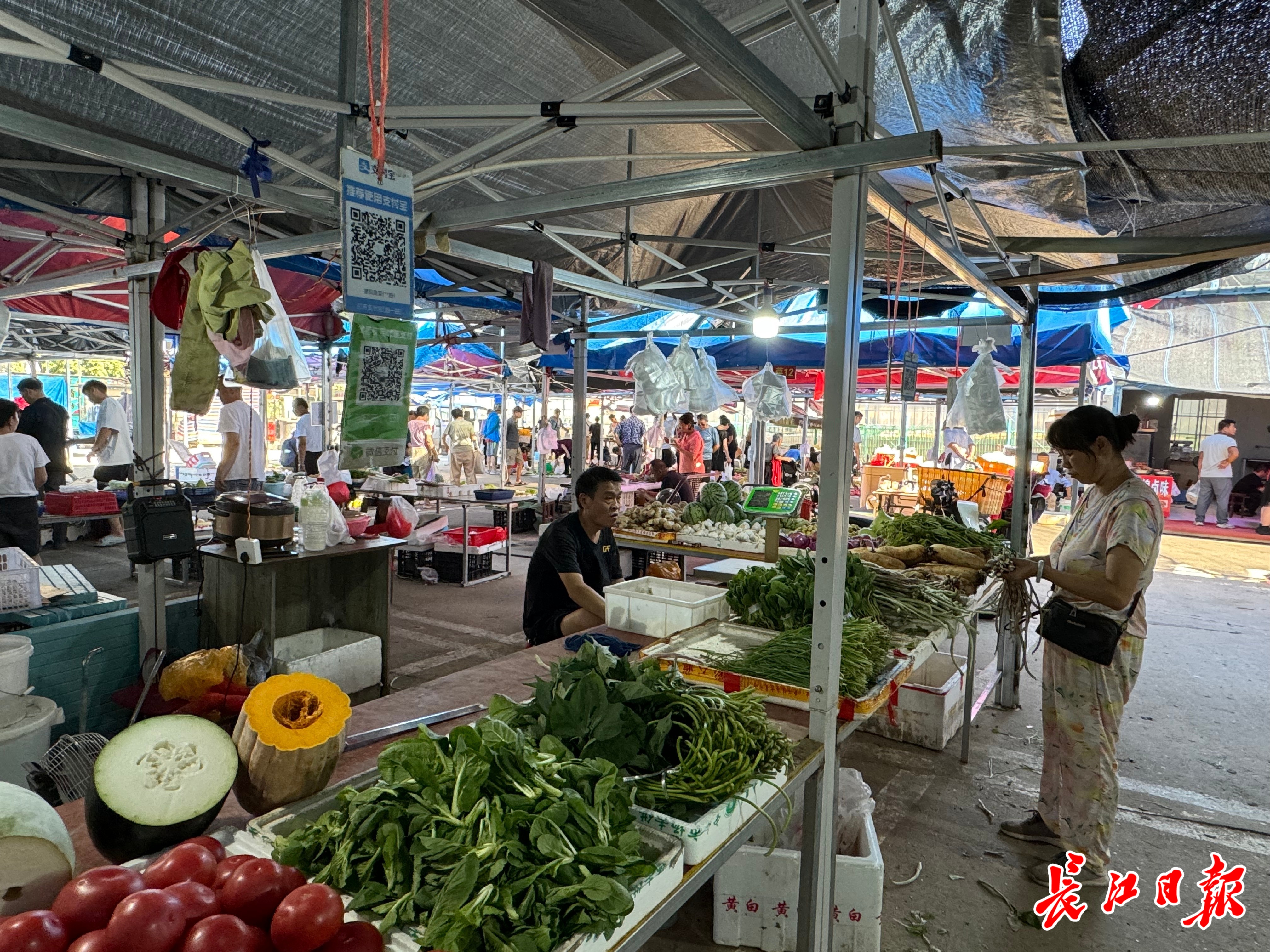 家住鸿岭花园的刘香莲晨练结束,就到马路对面的瑞景便利菜市场买菜。清晨,菜场人声鼎沸,豆角、茄子、竹叶菜等夏季时令蔬菜整齐摆在摊位上,新鲜的猪肉、鸡肉、水产吸引了附近居民前来购买。