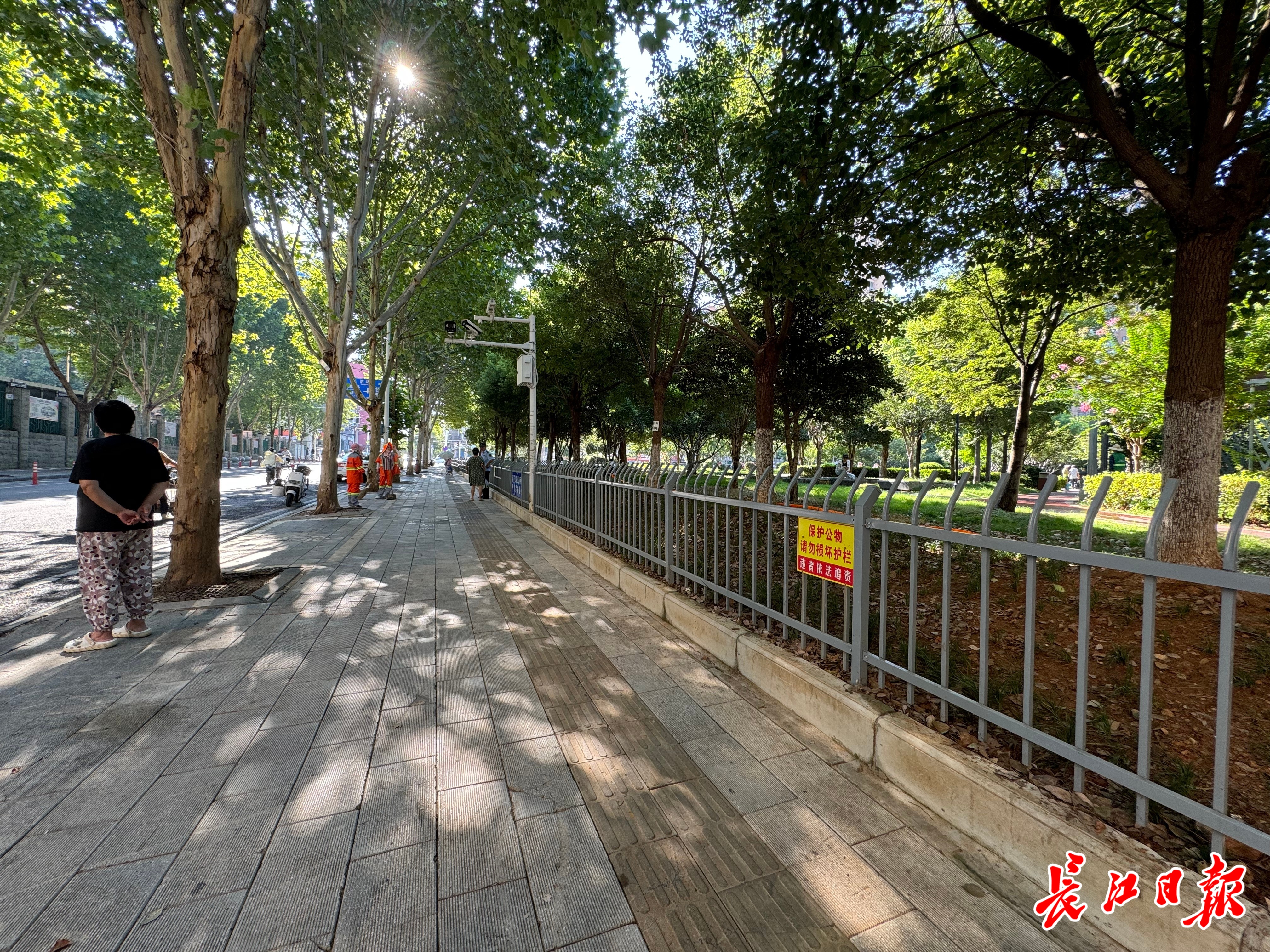 8月19日8时许,长江日报记者来到与石牌岭路交会的瑞景路,放眼望去,绿树成荫,整洁的人行道紧邻洪山菜薹公园,不少市民在公园散步晨练。