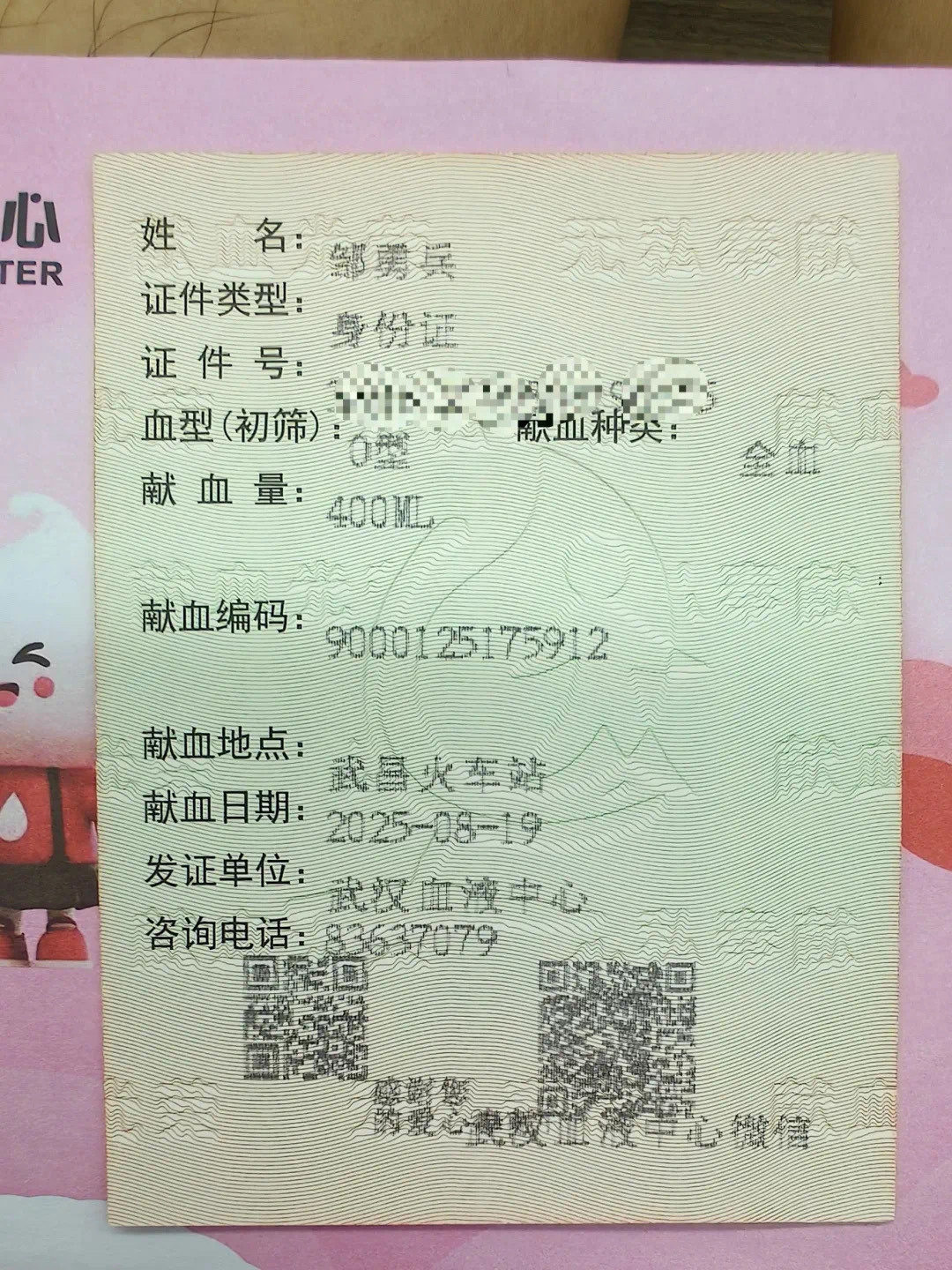 经过武昌区退役军人事务局的广泛号召,消息在“长江卫士”退役军人联络群中迅速传开。32岁的退役军人邹勇兵看到求助信息后,当即放下家中事务,顶着烈日出发。他先骑行至南湖附近的献血点,却得知该处仅能献成分血。未作半分停留,他立刻调转车头,奔赴6公里外的武昌火车站献血车,最终成功献出400毫升O型全血。