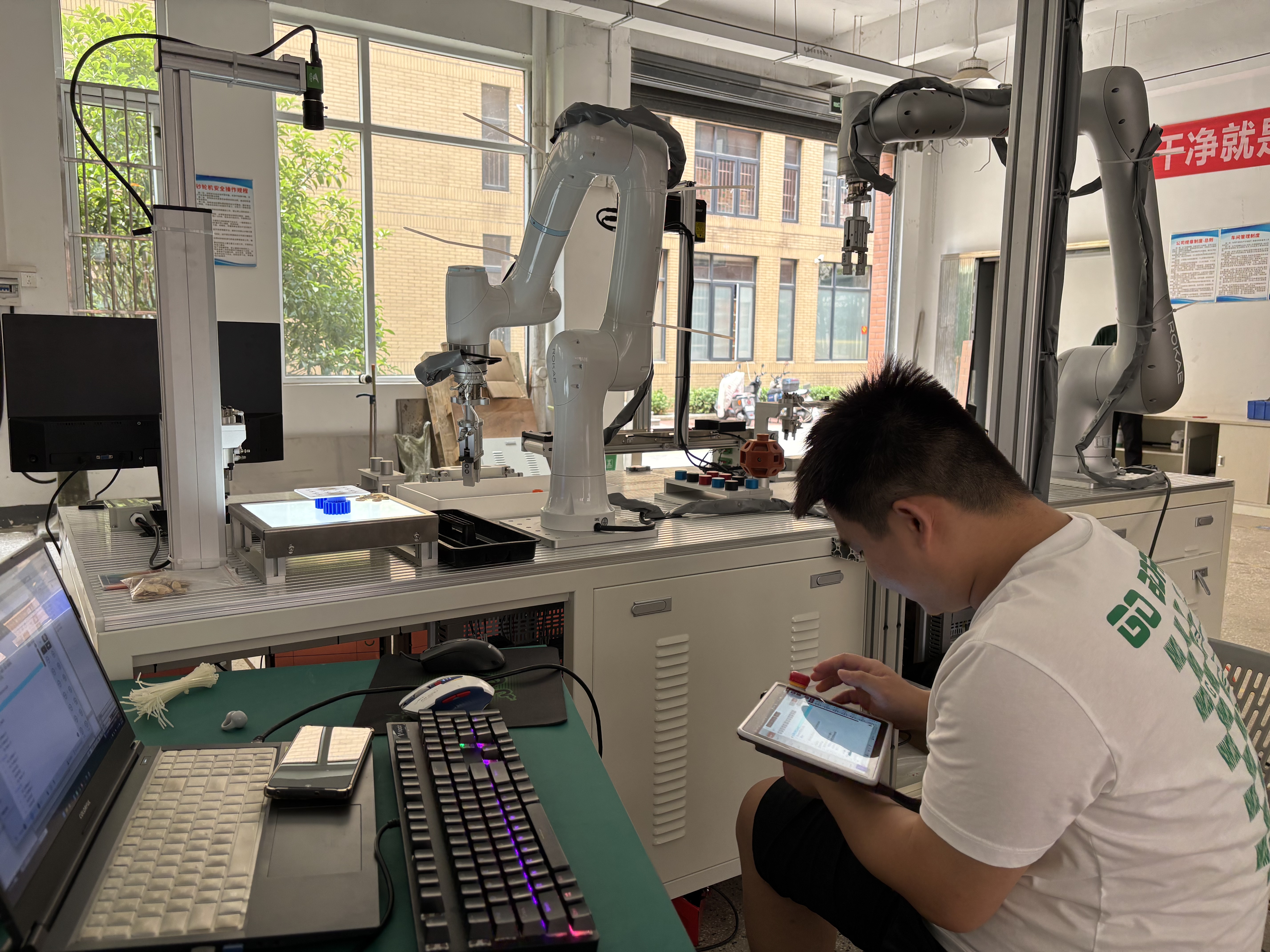 筑梦科技工程师正在测试研发的机器视觉和工业机器人实训平台。 栾嘉雯 摄
