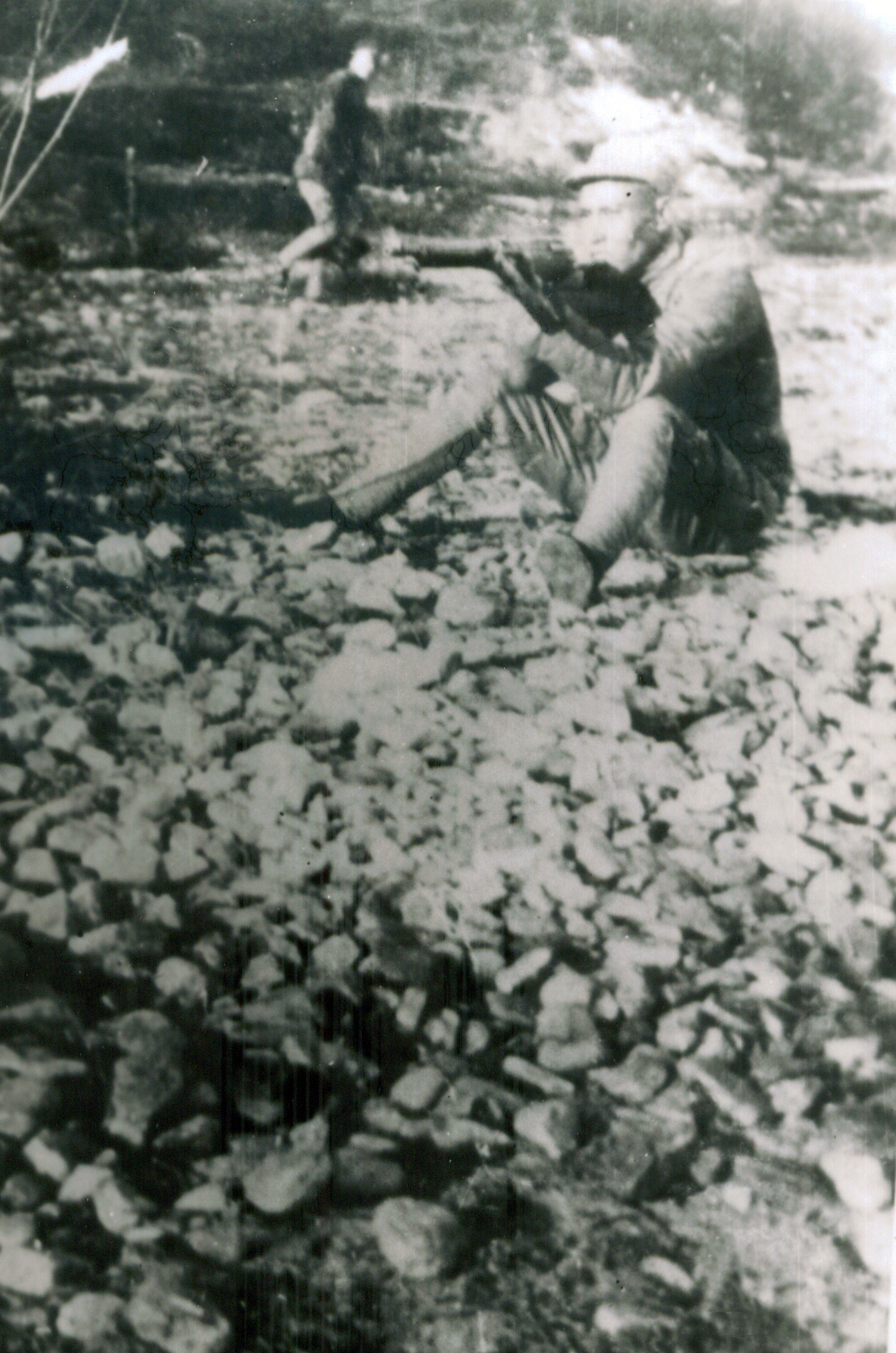 1943年,新四军第五师军政整训,时任十三旅旅长的周志坚做射击示范。 (湖北省档案馆供图)
