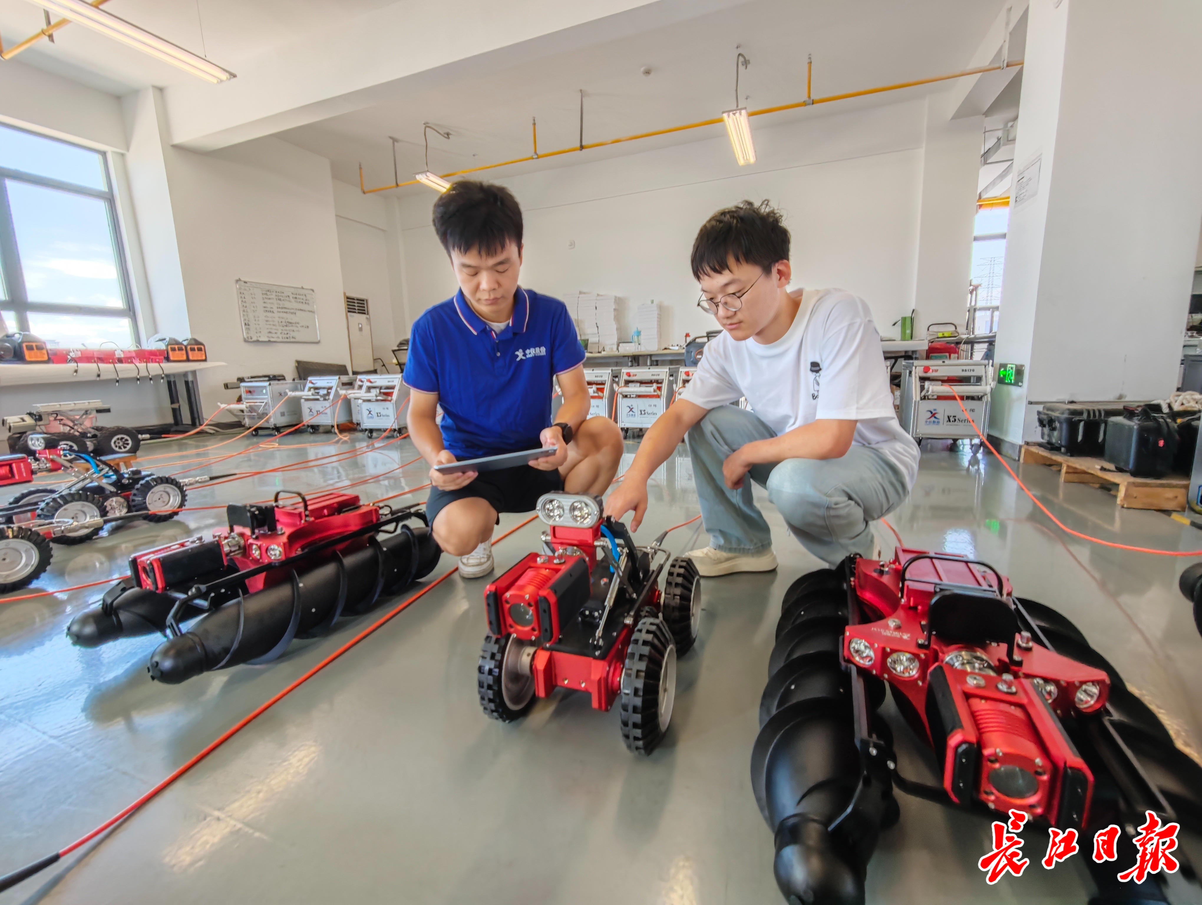 8月25日上午,室外热浪滚滚,江夏区邢远长街旁一家企业厂房内,生产同样火热,技术人员将一个个精密元件组装成能钻下水管道、替人干活的机器人。