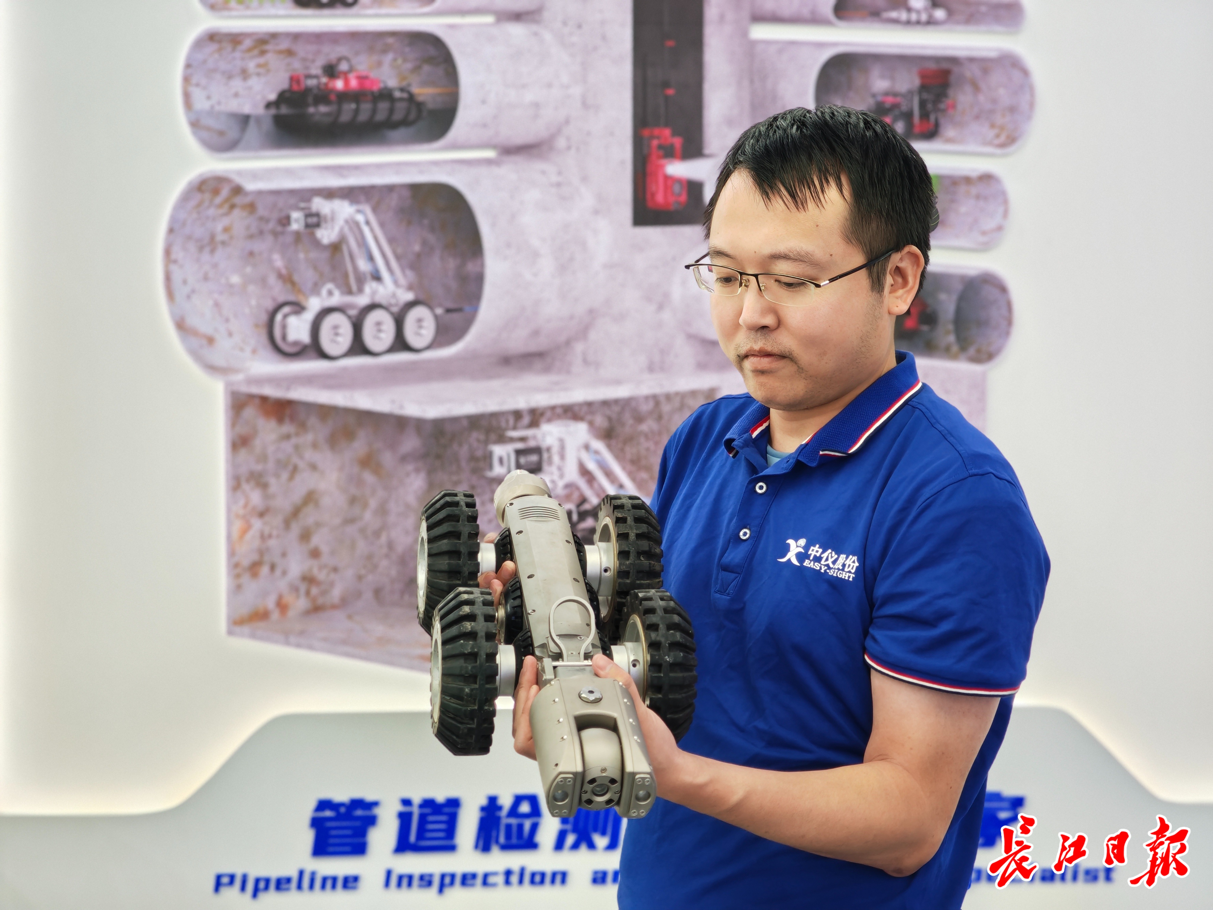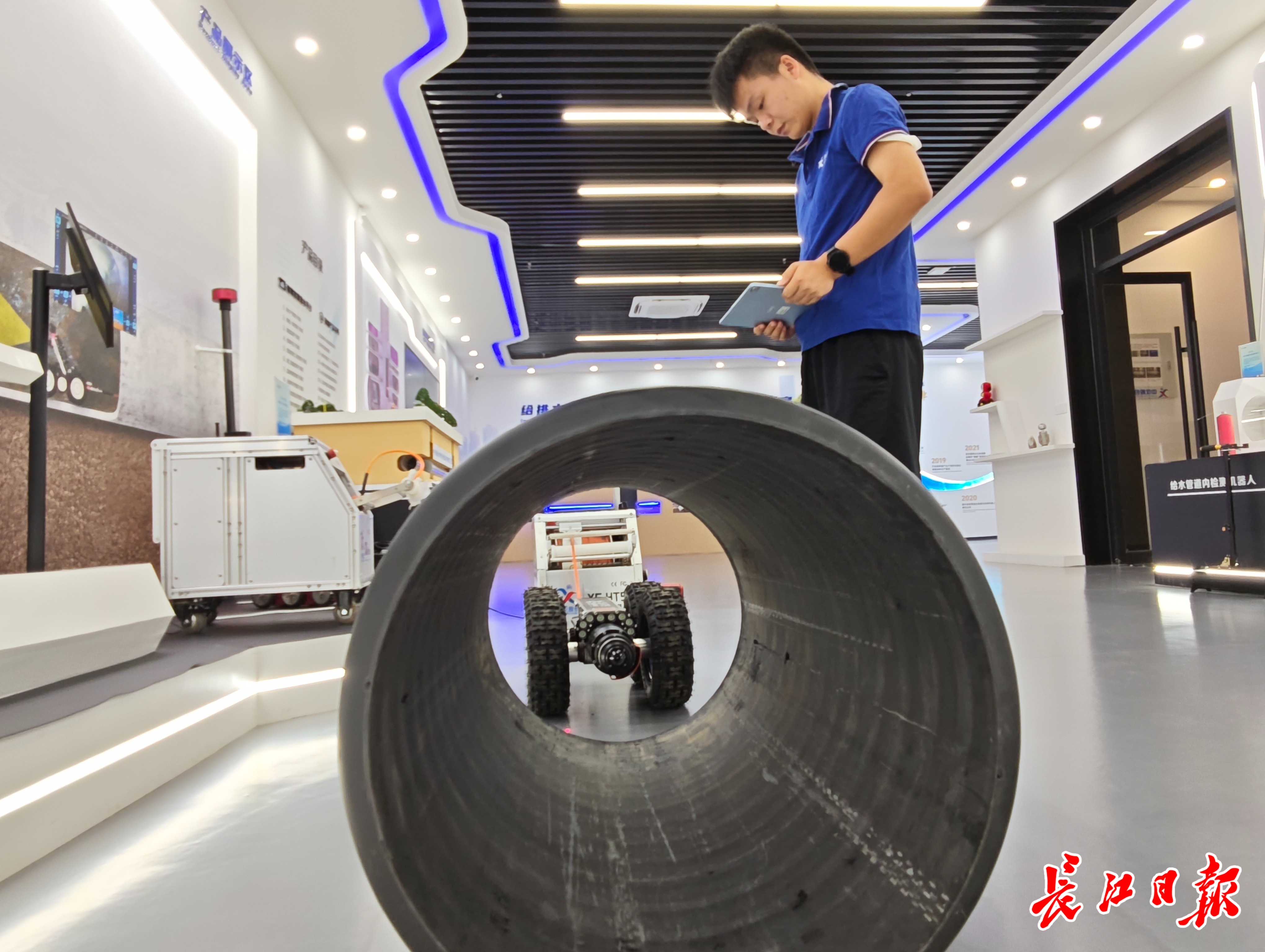 “我们努力让机器人‘眼睛’更聪慧,‘耳朵’更灵敏。”龚文俊接通一台由该公司研发的全球首款数字高清检测机器人的电源,机器人“头部”红色环形结构旋转起来,并投射红色光斑。“它如同机器人的眼睛,搭载自主研发的高精度环形扫描摄像头,能360度探测管道内的缺陷,回传图像能达到500万像素数字高清级画质,相比国外上一代产品,精度提升了4倍。”