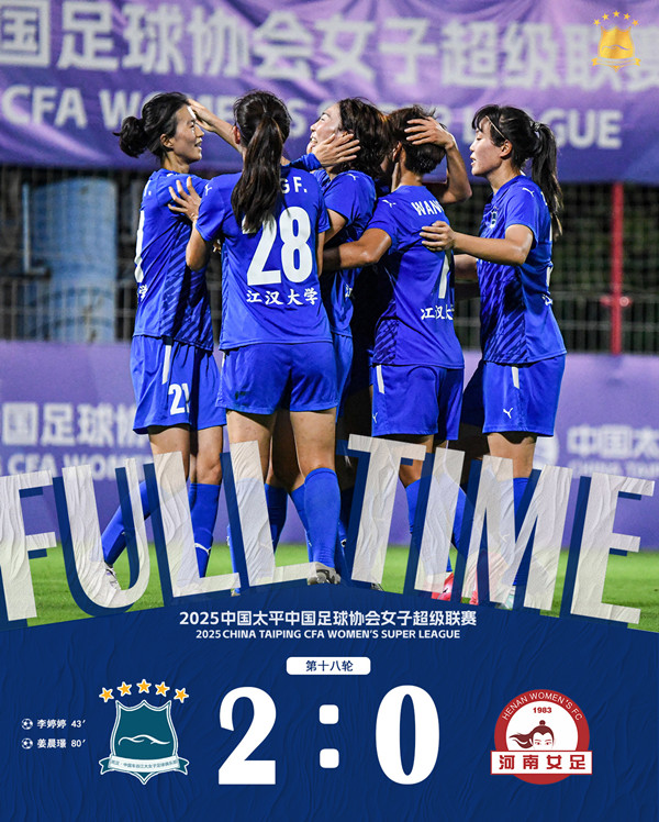第43分钟,宋端右路传中,李婷婷头球破门为武汉女足先拔头筹。第80分钟,吴海燕左路传中,姜晨璟推射再下一城。2:0,武汉女足主场击败河南女足。