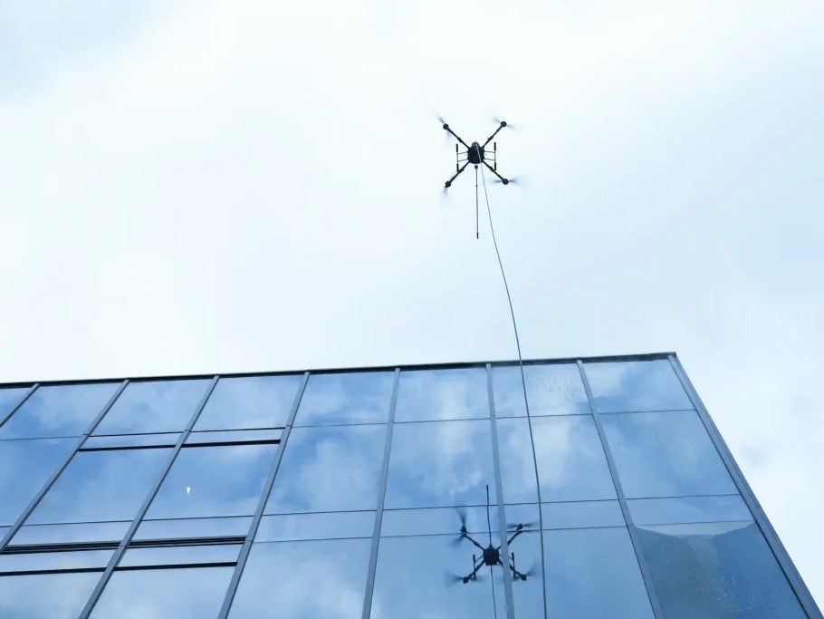 无人机正在清洗高层玻璃。通讯员王俊 摄