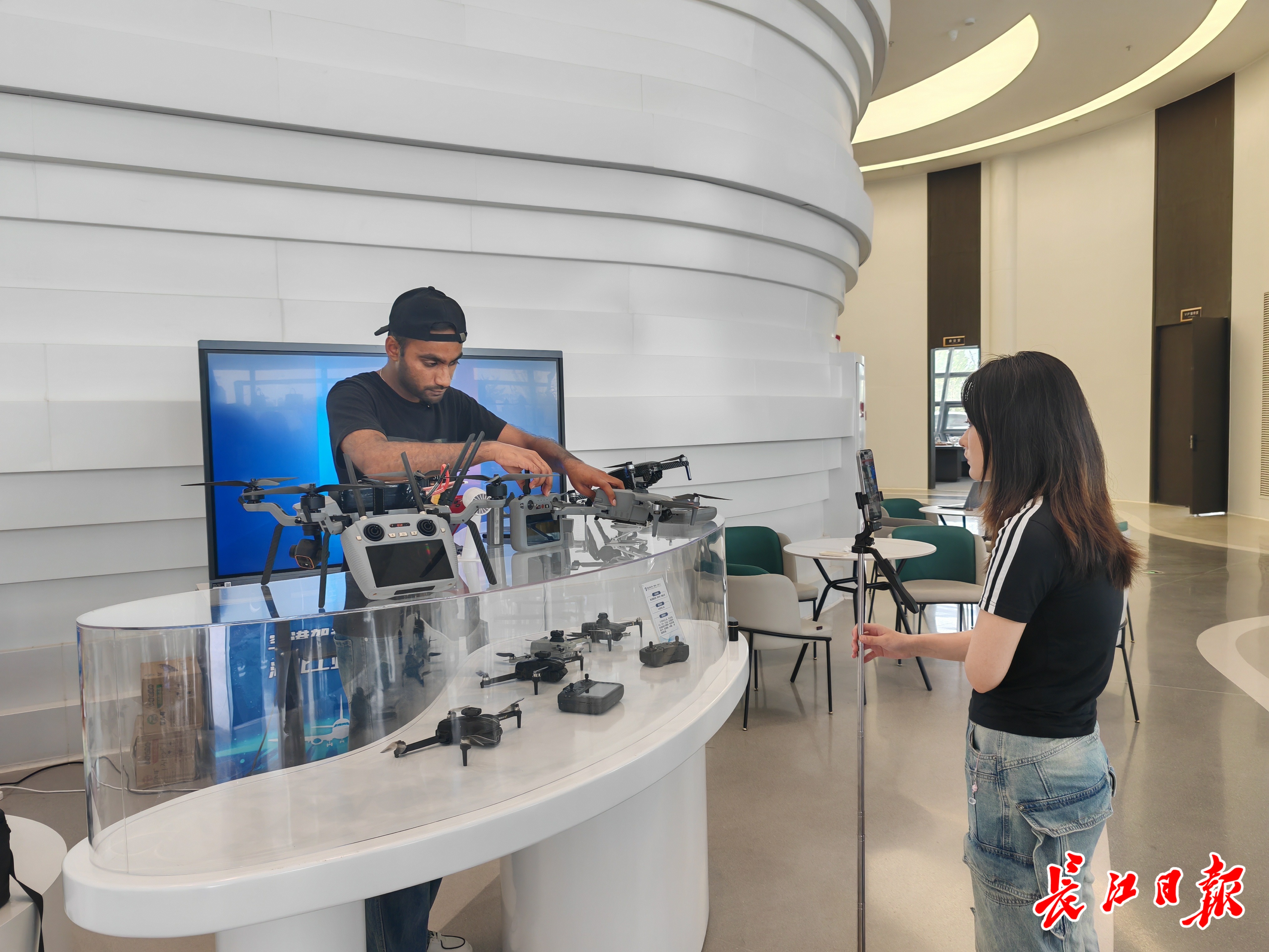 中国(鄂州)跨境电商产业园内,来自巴基斯坦的主播阿布正在直播推销无人机。 记者高喜明 摄