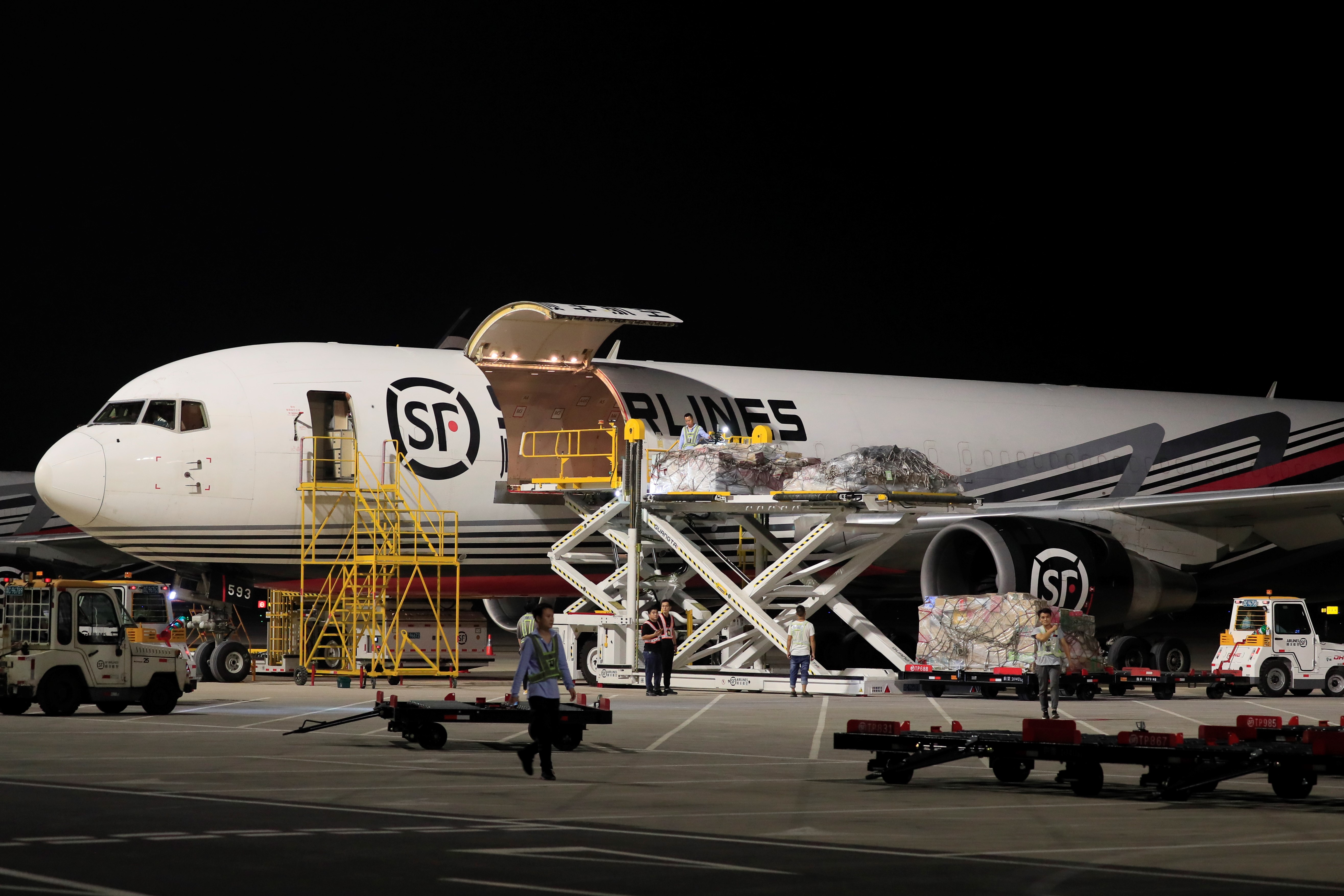 凌晨,花湖机场飞机正在装卸货。通讯员王星予 摄