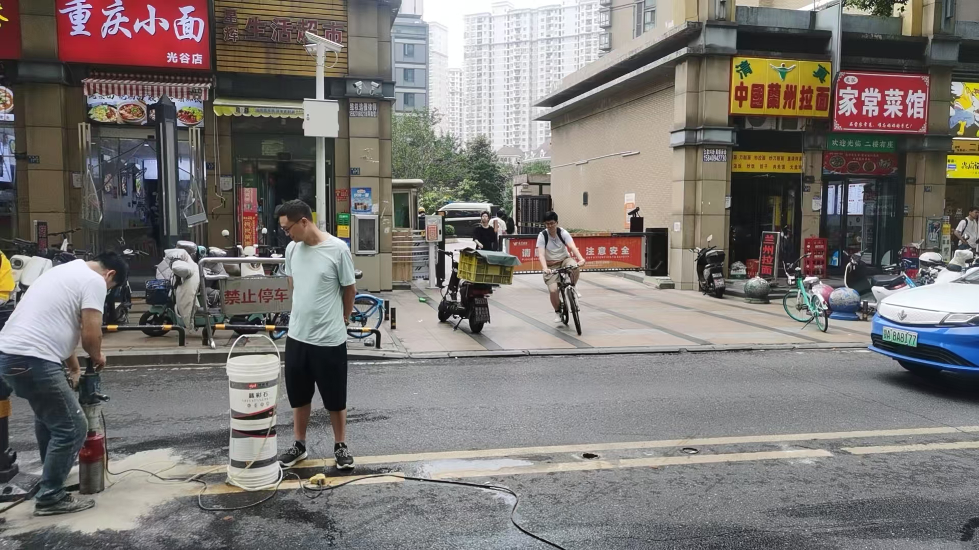 加州阳光小区北门出口外,隔离柱位置改造施工进行中。通讯员供图